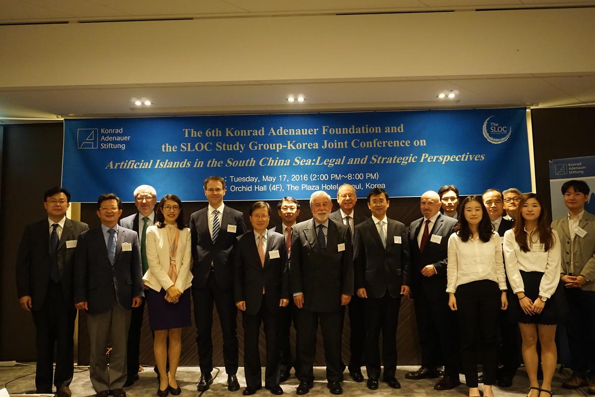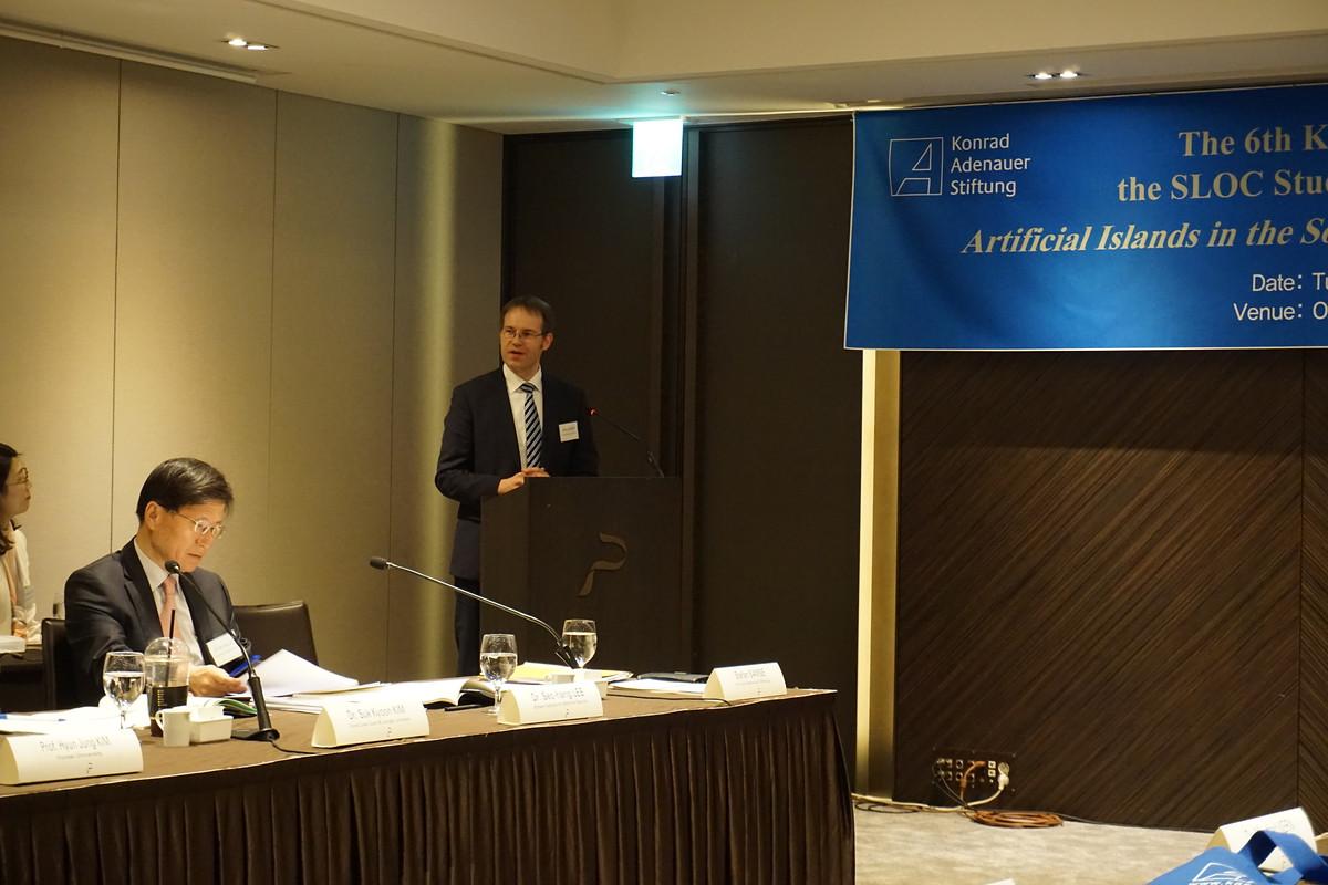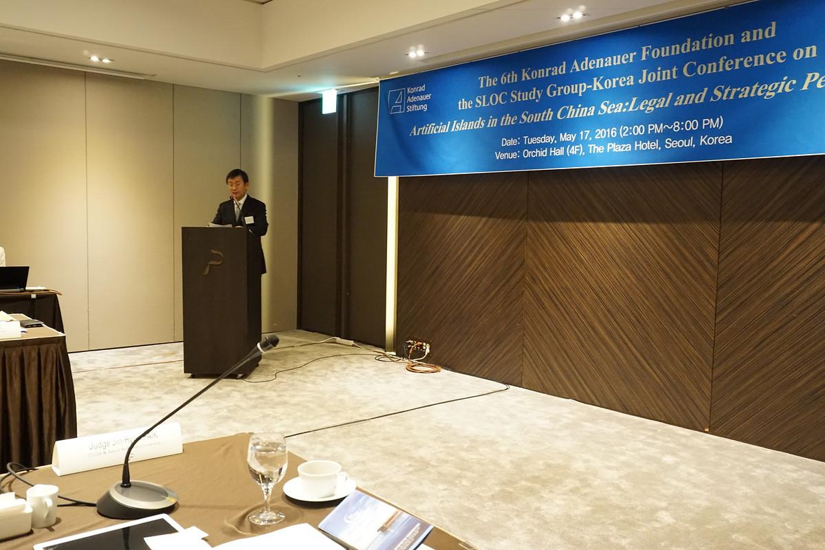 The joint conference kicked off with the opening remarks by KAS Resident Representative, Mr. Stefan SAMSE and Judge Jin-Hyun PAIK. Mr. SAMSE pointed out the export-oriented nature of both Germany and Korea and how maritime issues like trade routes posed a paramount significance for both economies. The overall theme, “artificial islands in the South China Sea,” provided the context for panels with differing expertise to discuss the timely issues concerning legal and strategic perspectives on the region. The first session was moderated by Dr. Seo-hang LEE from Korea Institute for Maritime Strategy (KIMS).