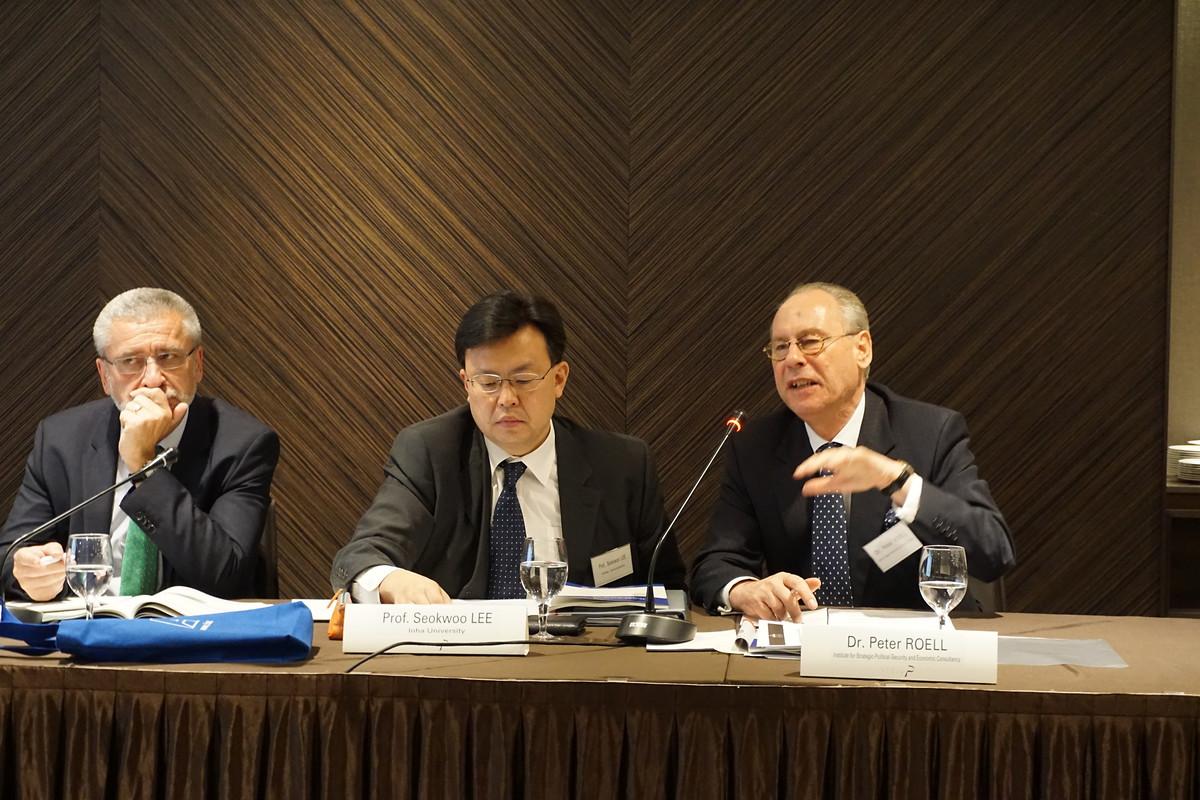 Dr. Manfred KERN, the Managing Director of agriExcellence GmbH, moderated the second session. Prof. Seokwoo LEE of Inha University Law School delivered a talk on the legal uncertainties and ambiguities surrounding the sovereignty and jurisdiction of maritime features known as LTEs (low-tide elevations) in the South China Sea. He emphasized the complicated nature of the dispute, which implicated historical, economic and political rights of claimants. Regarding Prof. LEE’s legal analysis, panels struggled to reach an understanding on the essence of the relationship between existing legal frameworks—like the UNCLOS—and de jure resolution of the conflict. This seemed especially true for Asia where the asymmetric use of power and the dispersion of economic centers changed the way international disputes were effectively arbitrated. Thus, new mechanism of conflict resolution seemed to remain a work in progress for all stakeholders including but not limited to China given their aggressive construction of artificial installations and militarization in the seas.