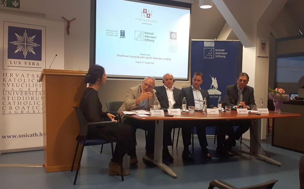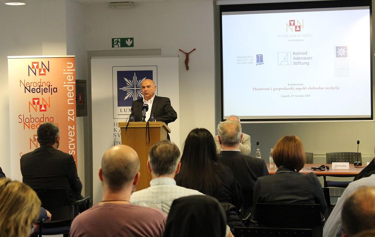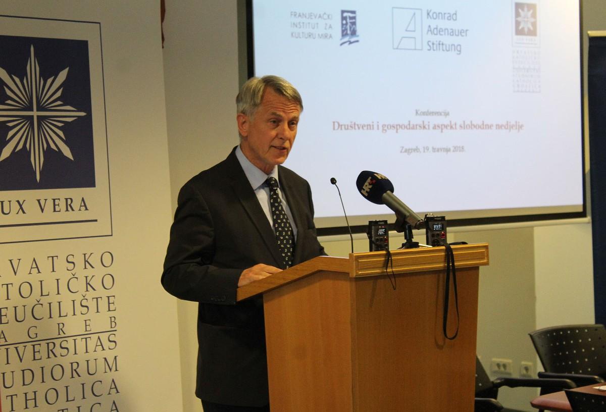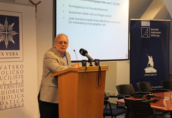 Die KAS veranstaltete mit der Kroatischen Katholischen Universität und dem Friedensinstitut der Franziskaner am 19. April 2018 in Zagreb eine Konferenz zum Thema: "Soziale und wirtschaftliche Aspekte des arbeitsfreien Sonntags in Kroatien“. Unter Mitwirkung eines Vertreters der Katholischen Arbeitnehmer Bewegung München: Hannes Kreller, diskutierten Vertreter der Zivilgesellschaft mit Gewerkschafts- und Kirchenvertretern sowie Wirtschaftsexperten über die Auswirkungen von arbeitsfreien Sonntagen.
