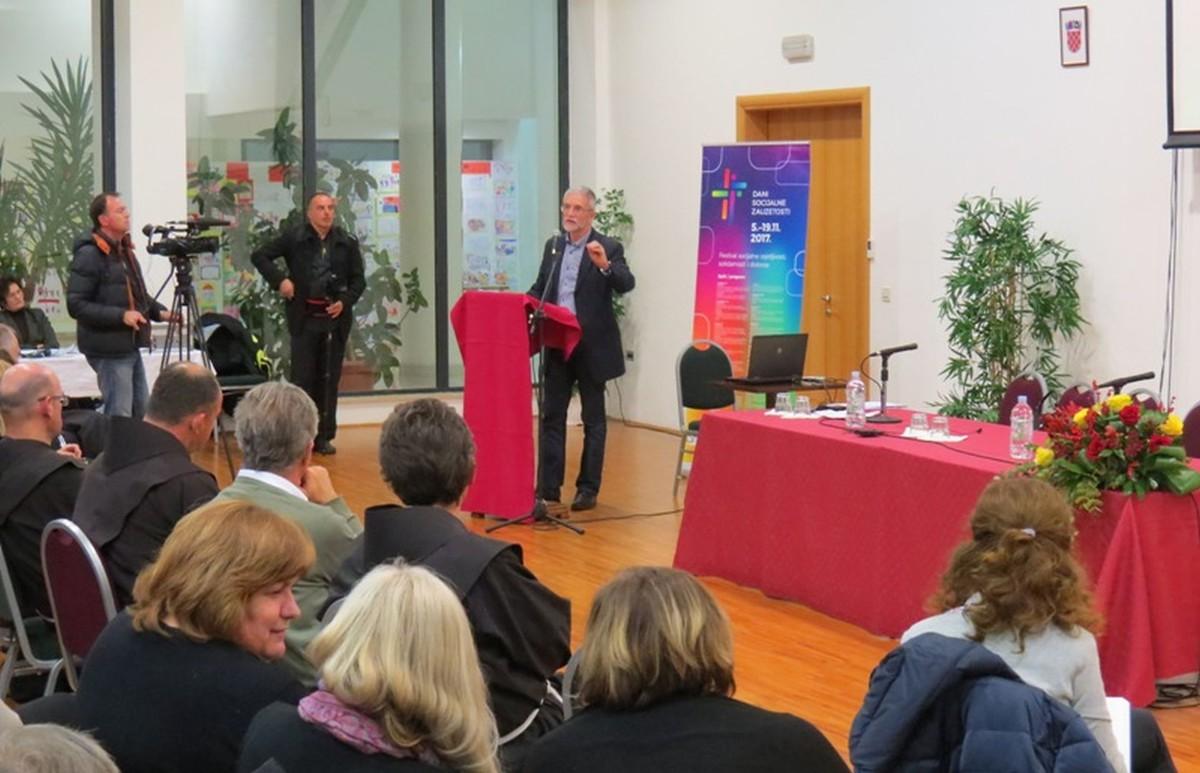 Podiumsdiskussion, v. l. n. r. Bože Vuleta (Leiter des Friedensinstituts der Franziskaner, 2.v.l.), Markus Blümel (Katholische Sozialakademie Österreichs), Krešimir Sever (Vorsitzender der Unabhängigen Kroatischen Gewerkschaften), Prof. Dr. Goran Črpić (Kroatische Katholische Universität), Andreas Luttmer-Bensmann (Katholische Arbeiterbewegung Deutschlands), Snježana Brajinović (Kammer für Arbeiter und Angestellte Wien) und Zlatica Štulić (Verband unabhängiger Gewerkschaften Kroatiens)