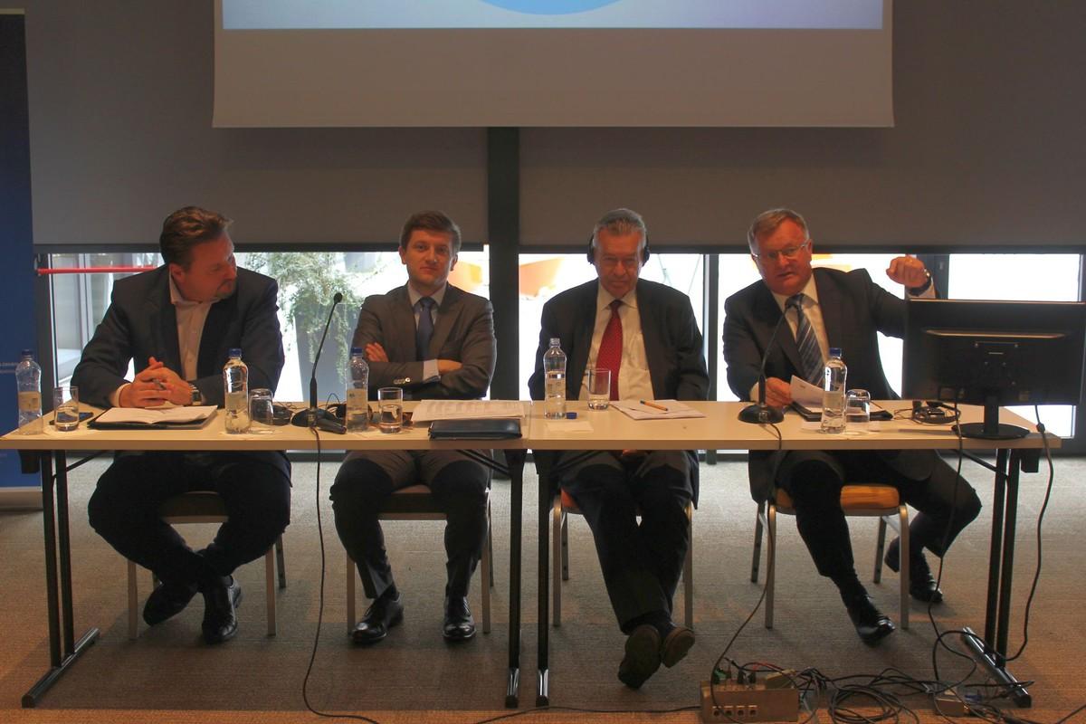 v. l. n. r. Lovro Kuščević (Verwaltungsminister der Republik Kroatien), Dr. Zdravko Marić (Finanzminister der Republik Kroatien), Otto Bernhardt (Vorstandsmitglied der KAS) und Srećko Prusina (Vorstandsvorsitzender der HDZ-Stiftung ZHDZ)