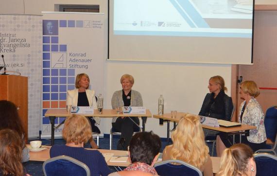 Podiumsdiskussion, v. l. n. r. Alenka Jeraj, Abgeordnete im slowenischen Parlament, Vorsitzende der SDS-Frauenorganisation; Iva Dimic, Abgeordnete im slowenischen Parlament, Vorsitzende der NSi-Frauenorganisation; Suzana Lara Kraus, Vorsitzende der SLS-Frauenorganisation und Moderatorin Mojca Sojar, Mitglied der NSi-Frauenorganisation