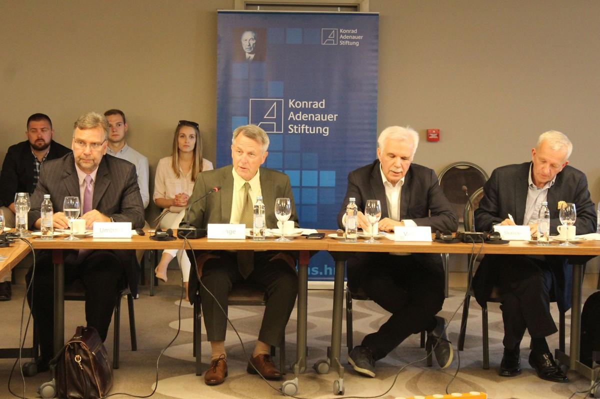 v. l. n. r. Dr. Frank Umbach (Forschungsdirektor des European Centre for Energy and Resource Security, King’s College London), Dr. Michael Lange (KAS), Prof. Dr. Mladen Vedriš (Vorsitzender der Zagreber Initiative, Rechtswissenschaftliche Fakultät der Universität Zagreb) und Miro Skalicki (Berater für Energiewirtschaft, Regionaldirektor von Shell a. D.)