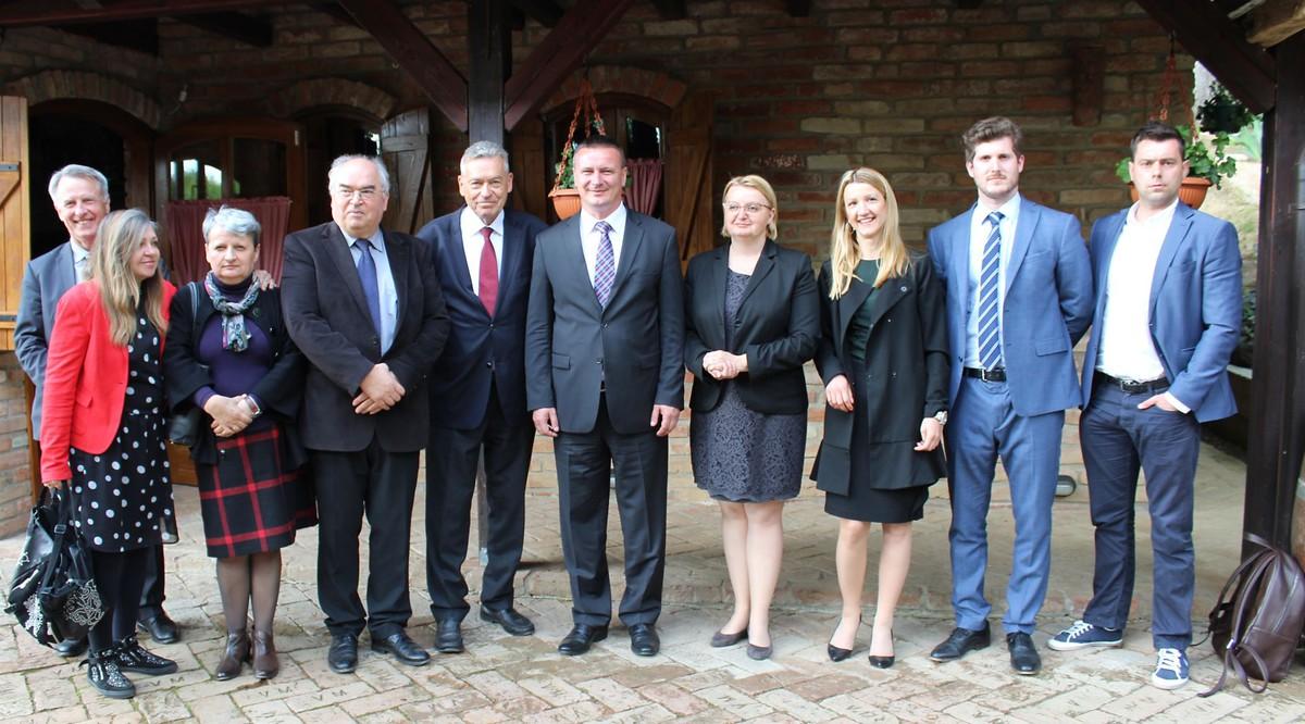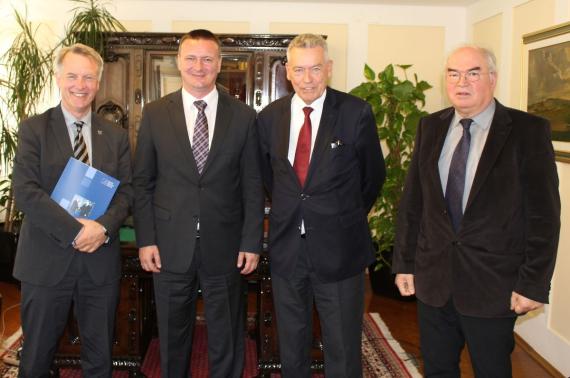 Gruppenfoto, v. r. n. l. Dragan Čarapina (Gesellschaftler und Prokurist IMR Hamburg GmbH), Otto Bernhardt (KAS-Vorstandsmitglied, Finanzpolitischer Sprecher der CDU/CSU-Bundesfraktion a. D.), Danijel Marušić (Landrat der Region Brodsko-posavska) und Dr. Michael Lange (KAS)