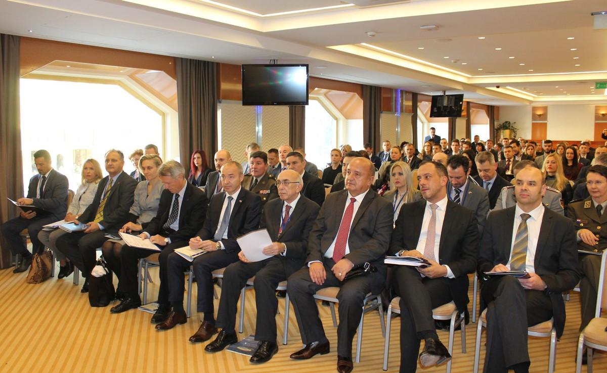 I. Podiumsdiksussion, v. l. n. r. Botschafter Haydar Berk (Direktor von RACVIAC), Dr. Damir Črnčec (politischer Berater des Verteidigungsministers der Republik Slowenien), Dr. Petar Mihatov (Assistenzminister im Verteidigungsministerium der Republik Kroatien, 4.v.l.), Dragan Nikolić (Staatssekretär im Verteidigungsministerium der Republik Mazedonien) und Sead Jusić (stellv. Verteidigungsminister der Republik Bosnien und Herzegowina)