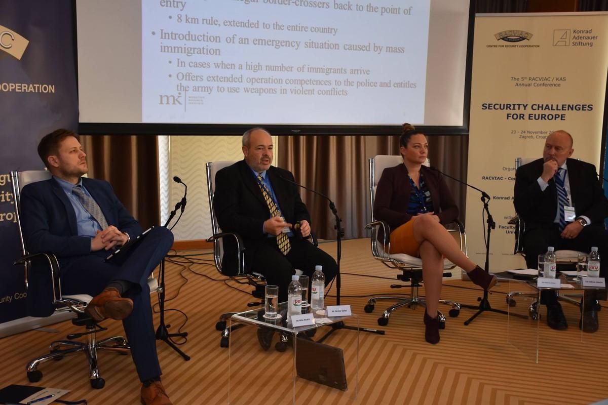 III. Podiumsdiksussion, v. l. n. r. Dr. Mišo Mudrić (Fakultät für Politikwissenschaften der Universität Zagreb), Dr. Sándor Gallai (Direktor des Migration Research Institute Hungary), Prof. Dr. Marta Zorko (Fakultät für Politikwissenschaften der Universität Zagreb) und Col. (GS) Andreas Jödecke (Abteilungsleiter des Bundesamtes für Migration und Flüchtlinge "Nord")