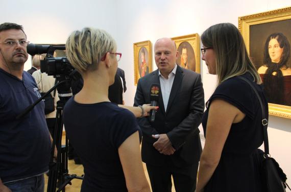 TV-Interview mit MdB Hartmut Koschyk (Beauftragter der Bundesregierung für Aussiedlerfragen und nationale Minderheiten) während der Ausstellung "Esseker Spuren" aus Anlass des 25. Jahrestages der Gründung der Deutschen Gemeinschaft (Museum der bildenden Kunst in Osijek)