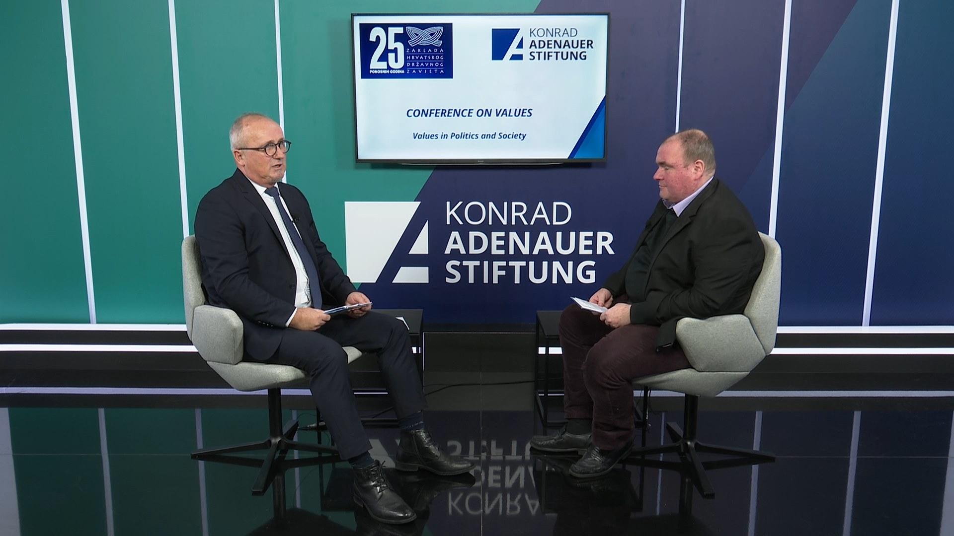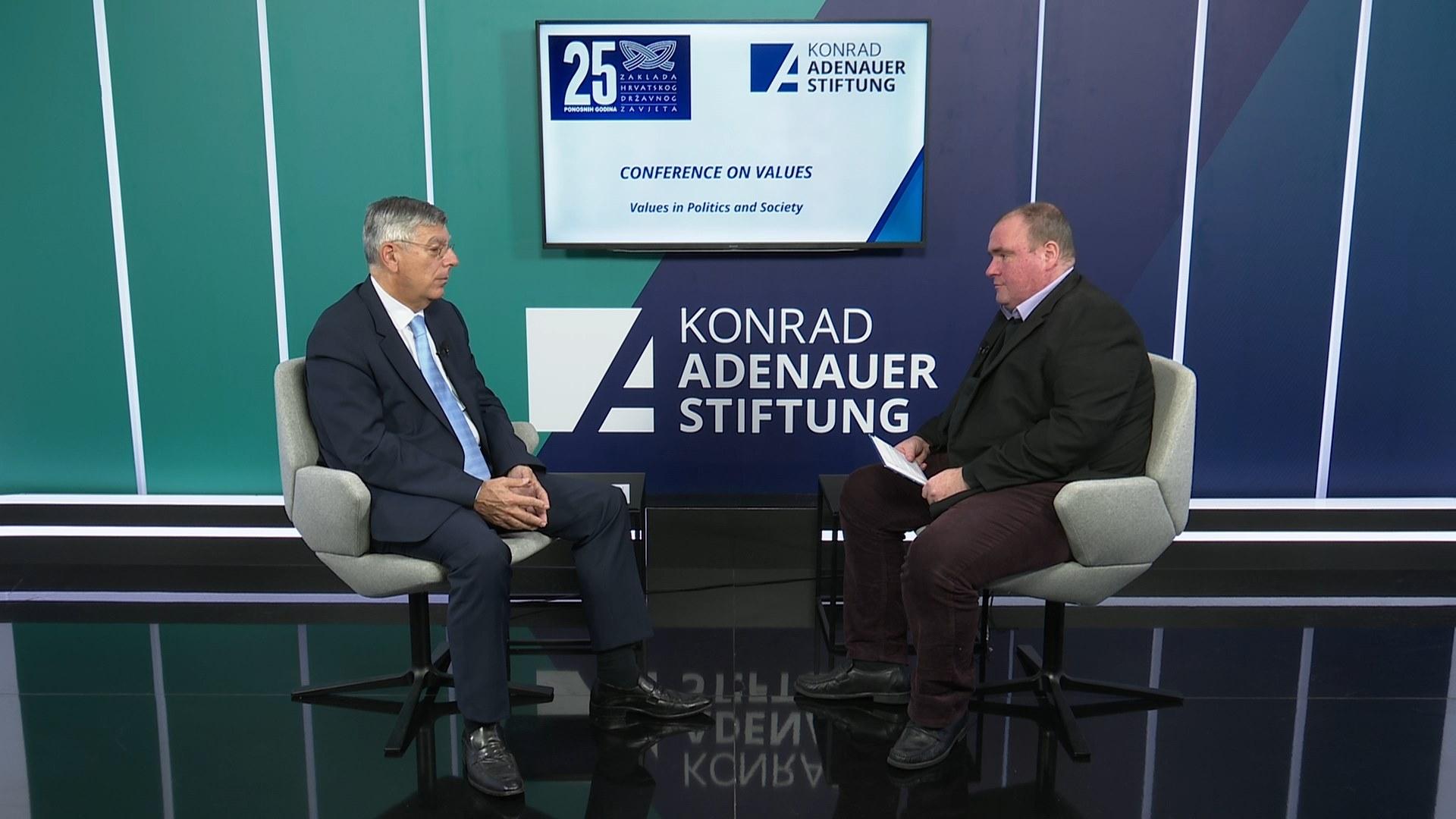 The Konrad-Adenauer-Stiftung organized together with the Croatian Statehood Foundation (ZHDZ) on December 7th, 2020, the usual annual Congress on Values in politics and society. Because of the coronavirus pandemic, we held this year's Congress on Values in the TV Studio, respecting all prescribed epidemiological measures. We spoke with our guests Prof. Željko Reiner, PhD, Vice President of the Croatian Parliament, Prof. Željko Tanjić, PhD, rector of the Catholic University of Croatia and Janez Cigler Kralj, Slovenian Minister for Labour, Family, Social Affairs and Equal Opportunities, about Christian democratic values in politics and society during these difficult times caused by the coronavirus pandemic.