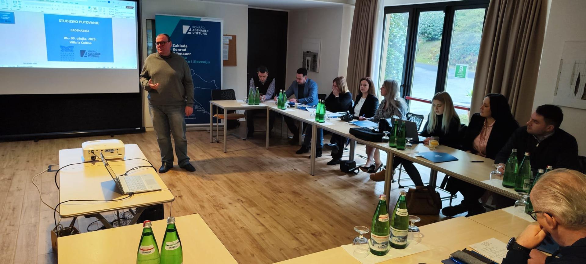 Together with the Croatian Statehood Foundation, the Konrad Adenauer Foundation organized a study trip for the participants of the 2nd and 3rd generation of the Political Academy PLUS of the ZHDZ in Cadenabbia, Italy, from March 6th to 9th, 2023. Within the study trip, the participants were received in Milan by the Consul of the Republic of Croatia in Italy, Mr. Stjepan Ribić, who introduced the participants to the functioning of the Italian administration and Croatian emigration. During the study trip, participants took part in lectures on European values, migration challenges, challenges of inflation and introduction of the euro, labor market adjustment in the context of green and digital transition, and reform of the Croatian electoral system.