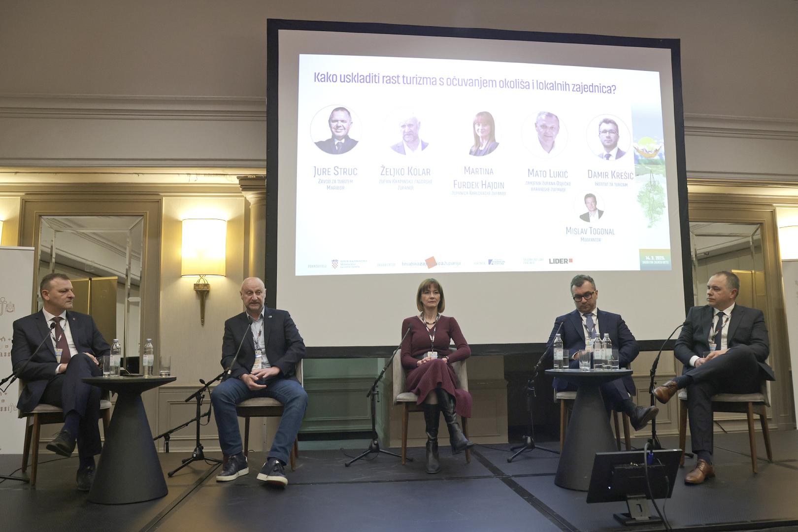 Martina Furdek Hajdin, Gespanin (Landrätin) der Gespanschaft (Landkreis) Karlovac; Željko Kolar, Gespan (Landrat) der Gespanschaft (Landkreis) Krapina-Zagorje; Damir Krešić, Direktor des Instituts für Tourismus; Mato Lukić, Gespan (Landrat) der Gespanschaft (Landkreis) Osijek-Baranja; Jure Struc, Slowenisches Institut für Tourismus und Moderator: Mislav Togonal, HRT (Kroatische Rundfunk und Fernsehen)