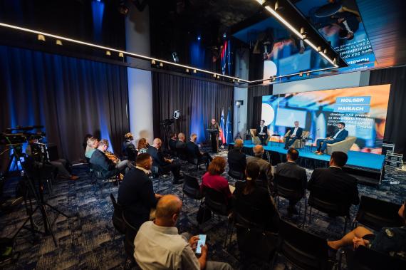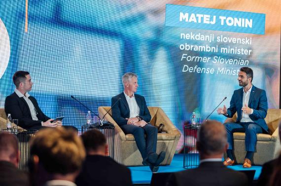 Moderator; Artis Pabriks, Verteidigungsminister der Republik Lettland und Matej Tonin, Parteivorsitzender der NSi; Verteidigungsminister der Republik Slowenien a.D.; Präsident der Staatsversammlung der Republik Slowenien a.D.