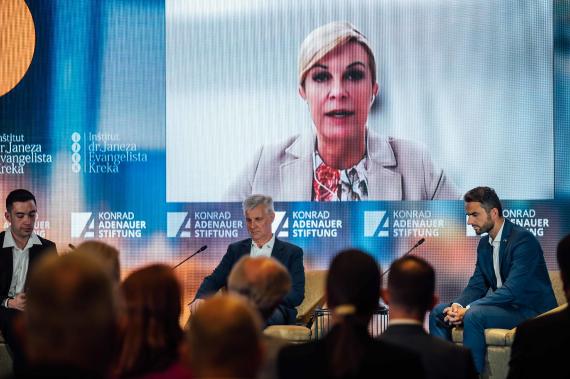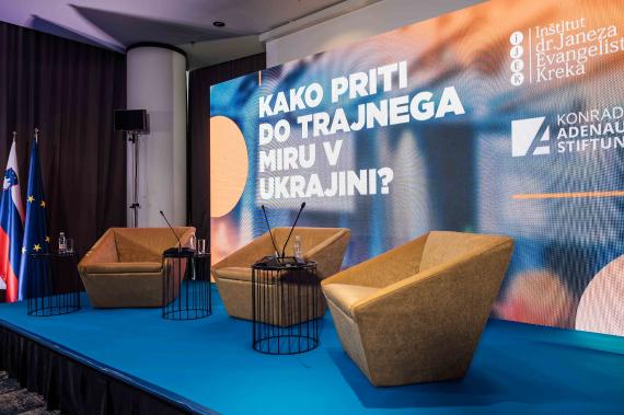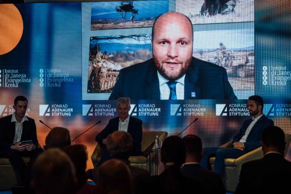 In collaboration with the NSi institute "Dr. Janez Evangelist Krek" (IJEK) of the Slovenian party "New Slovenia", the Konrad Adenauer Foundation organized a round table discussion on the subject: "How to Achieve Lasting Peace in Ukraine?" on September 12th, 2023 in Ljubljana. With the participation (online) of the former President of the Republic of Croatia, Kolinda Grabar-Kitarović, the former Minister of Defense of the Republic of Latvia, Artis Pabriks, and the former Minister of Defense of the Republic of Slovakia, Jaroslav Nad, discussed with the leader of the NSi party and former Minister of Defense of the Republic of Slovenia, Matei Tonin, on Eastern Europe's response to future security and defense challenges related to the war in Ukraine, as well as on understanding in Southeast Europe and the Balkan Region to invest more in defense and support war-ravaged Ukraine.