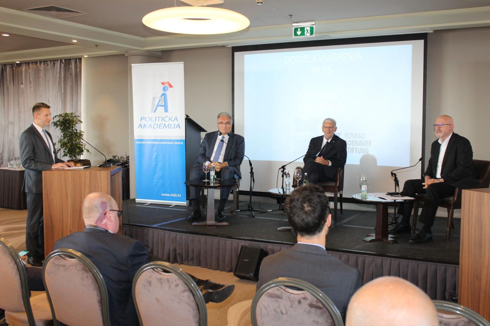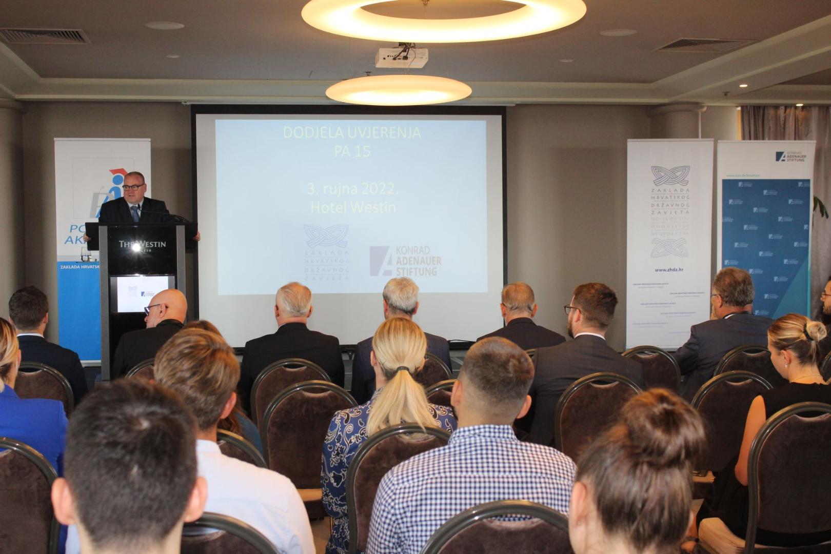 In the presence of the Deputy Prime Minister and Minister of the Interior of the Repubic of Croatia, Davor Božinović, PhD, the HDZ general secretary, Krunoslav Katačić, MEP Karlo Ressler, Deputy Head of Mission at the German Embassy in Croatia, Harald Seibel as well as other representatives of the party leadership and the Croatian Statehood Foundation (ZHDZ), certificates were handover to graduates of the 15th generation of the Political Academy for their successful participation in this year's political program for the education of young politicians on September 3rd, 2022 in Zagreb. This event represents the beginning, or to be precise, the first seminar of the 16th generation of the ZHDZ Political Academy.