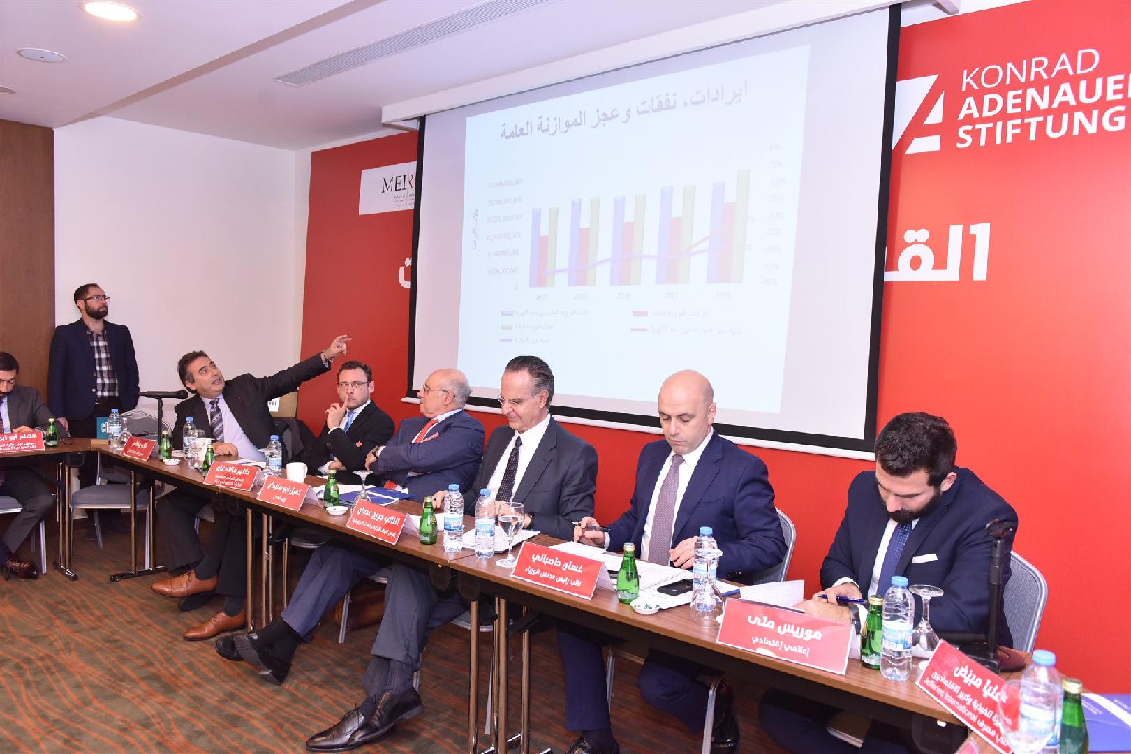 Six contributions followed the opening remarks. The first one was by Mr. Alain A. Bifani, the Director General of the Ministry of Finance on “The Lebanese General Budget in Figures and Facts”. The second contribution was made by Dr. Nassib I. Ghobril, Head of Group Economic Research and Analysis of Byblos Bank SAL on “Salaries and wages in the general budget”. The economic and financial expert Mr. Mazen Sweid talked about the structural reforms in the Lebanese public budget. The first observer of the Department of Studies at the Supreme Council of Customs, Mr. Hisham Abu Ibrahim, stopped at the reality of customs evasion and countering the procedures. The head of the Lebanese Association for rights of taxpayers Mr. Karim Dahir’s contribution was on "Tax evasion in numbers and means of control and prosecution". The final contribution was given by Mrs. Alia Moubayed, the Managing Director, Sovereign Analyst, and Fixed Income Strategist at Jefferies on “Budget deficits, global financial markets and foreign investors' expectations for solutions”. The floor was then opened for discussions.
