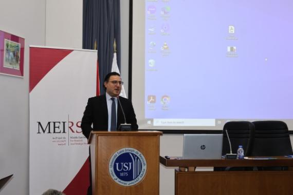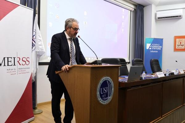The conference opened with welcoming remarks from Prof. Fouad Zmokhol, Dean of the Faculty of Business Administration at USJ, who emphasized the role of academia in rebuilding trust, fostering public awareness, and empowering youth at this critical moment in Lebanon’s history. Mr. Michael Bauer, Director of KAS Lebanon, highlighted the university's role as a driver of change and called for practical political engagement that transforms challenges into actionable solutions. Dr. Elie Elias, Director of MEIRSS, underscored the importance of bridging academic research with policy implementation, especially in a context that demands rigorous, applied knowledge to navigate structural collapse.