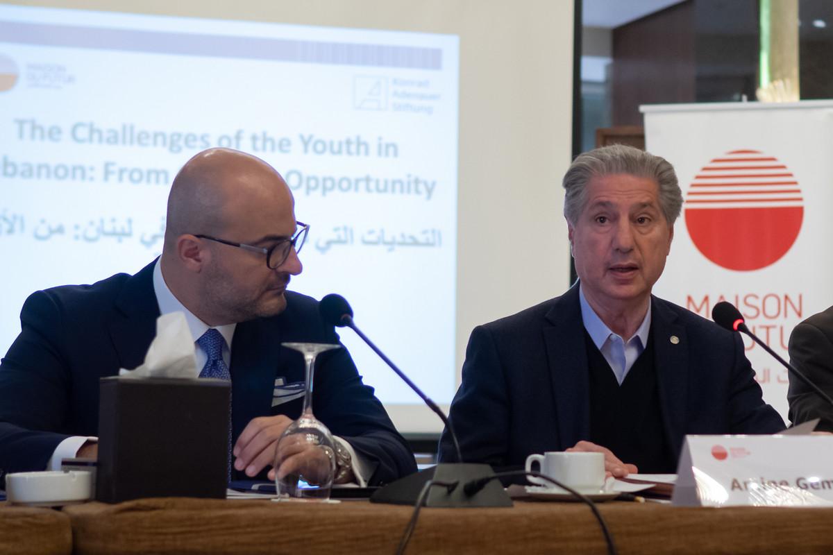 The conference on “The Challenge of the Youth in Lebanon” was opened by former president and head of Maison du Futur (MdF) Amine Gemayel and the representative of the Konrad-Adenauer-Stiftung Lebanon (KAS) Dr. Malte Gaier.