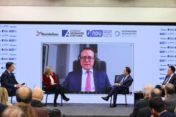 The launch event featured a panel discussion with national and international experts, moderated by journalist Majed Bou Hadir. MP Dr. Ghada Ayoub, member of the Lebanese Parliament, and Dr. Ziyad Baroud, head of the Decentralization Observatory at Notre Dame University- Louaize and former Minister of Interior, joined from Lebanon. From Germany participated Mr. David Lüngen, city director and the first deputy mayor of Mülheim an der Ruhr, and from Iraq, Dr. Hamza Haddad, visiting fellow at the European Council on Foreign Relations. The panelists analyzed the prospects and challenges of decentralization as well as scenarios and factors that need to be considered when discussing the empowerment of local administrations.