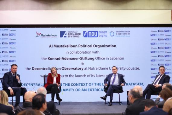 On Friday, January 20th, 2023, Konrad-Adenauer-Stiftung Lebanon, “Al Mustakelloun” Political Organization and the Decentralization Observatory at Notre Dame University-Louaize jointly organized the launching event of a new study on decentralization in the context of the Lebanese stratagem. The event