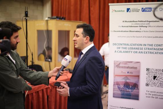 On Friday, January 20th, 2023, Konrad-Adenauer-Stiftung Lebanon, “Al Mustakelloun” Political Organization and the Decentralization Observatory at Notre Dame University-Louaize jointly organized the launching event of a new study on decentralization in the context of the Lebanese stratagem. The event, held at Notre Dame University-Louaize main campus, attracted a high level of participation from experts, politicians, and representatives from civil society.