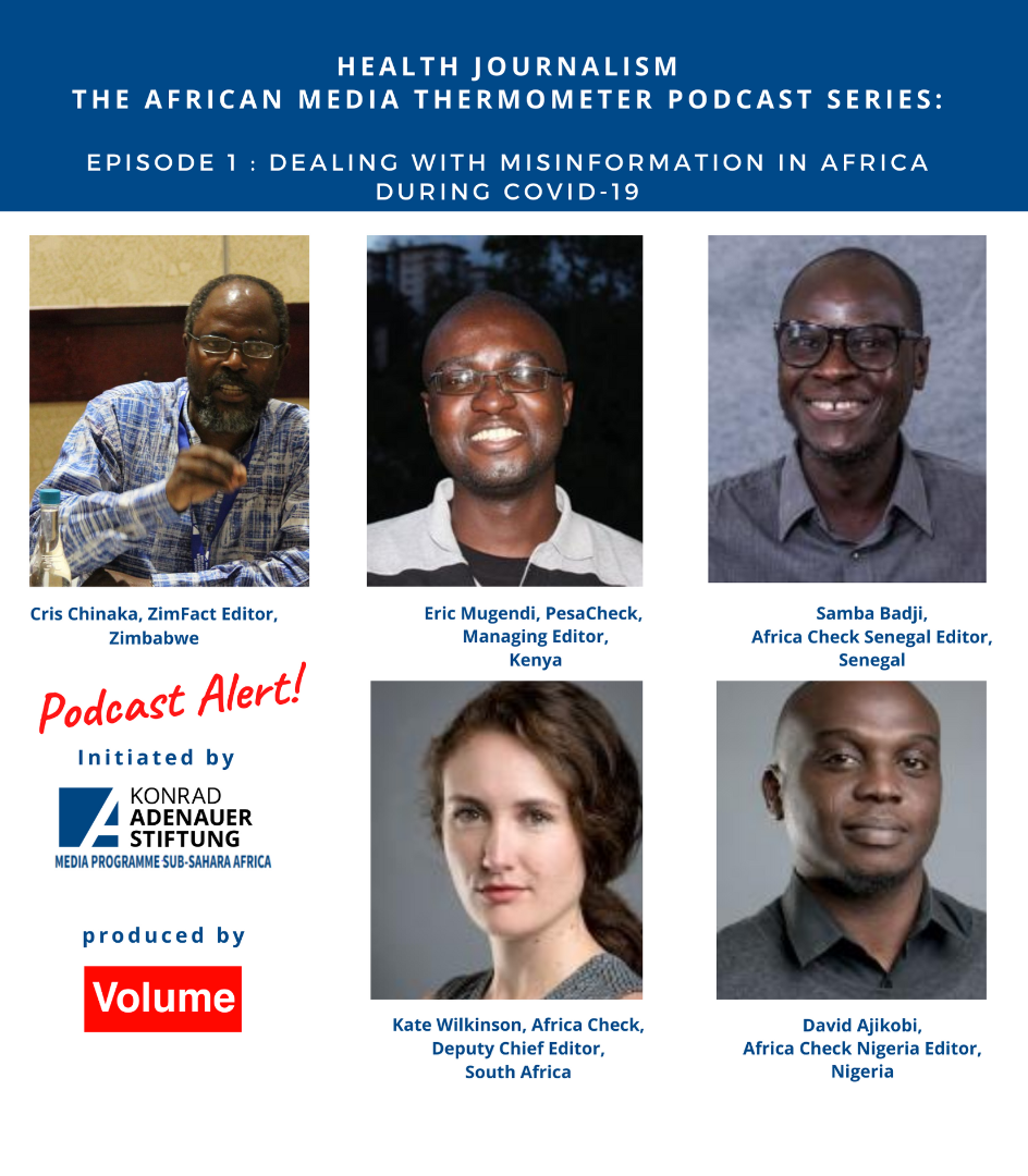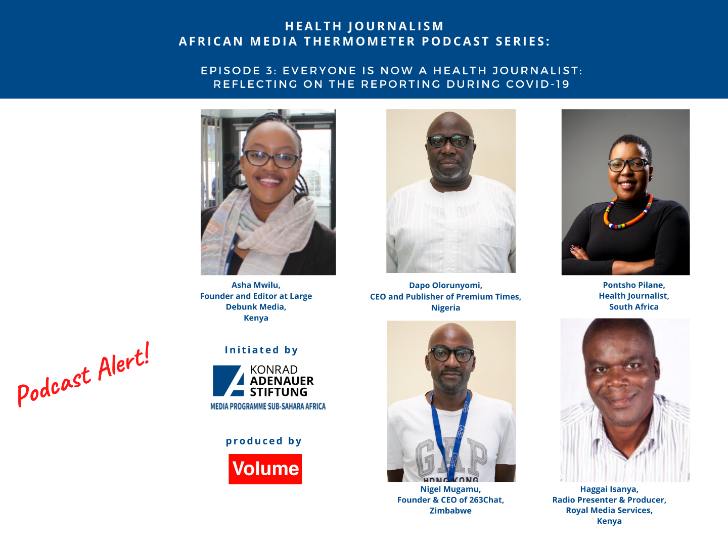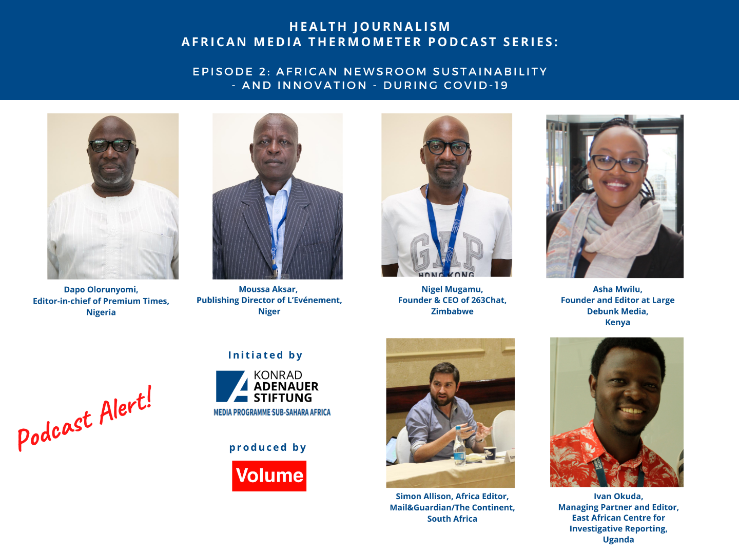 KAS Media Africa, the Media Programme of the Konrad-Adenauer-Stiftung, is looking into the effects the pandemic is having on newsrooms; we examine misinformation on health issues, business models for health journalism and analyse the questions of quality and credibility in the media in Africa. In a series of podcasts we speak to our colleagues in Niger, Nigeria, Senegal, Kenya, Zimbabwe and South Africa. The podcasts will go out weekly on Thursdays on August 13th, 20th and 27th 2020 and can be found on our website www.kas.de/mediaafrica, on our FB page @KASMediaAfrica and on Twitter: @KASMedia.
