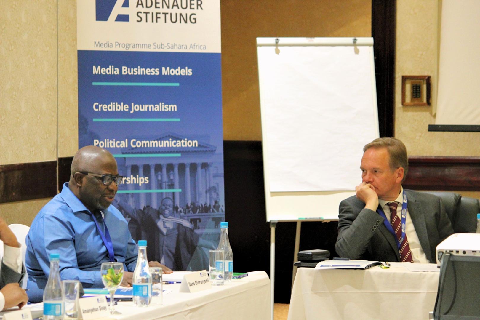 During the presentations, case studies, such as from Zimbabwe and Germany, alternated with regional overviews. Roukaya Kasenally, Chair of the African Media Initiative, investigated the question of whether the media in Africa really constitute the Fourth Estate, while Markus Spillmann, President of the International Press Institute, outlined the situation in Europe. Eminent media personalities such as Charles Onyango-Obbo from Uganda and Dapo Olorunyomi from Nigeria contributed significantly to the debates. Christoph Plate, Director of the KAS Media Programme Sub-Sahara Africa, commented: "We try to bring important personalities from the media industry together and promote exchange - because there are many similarities between the media in Africa and Europe".