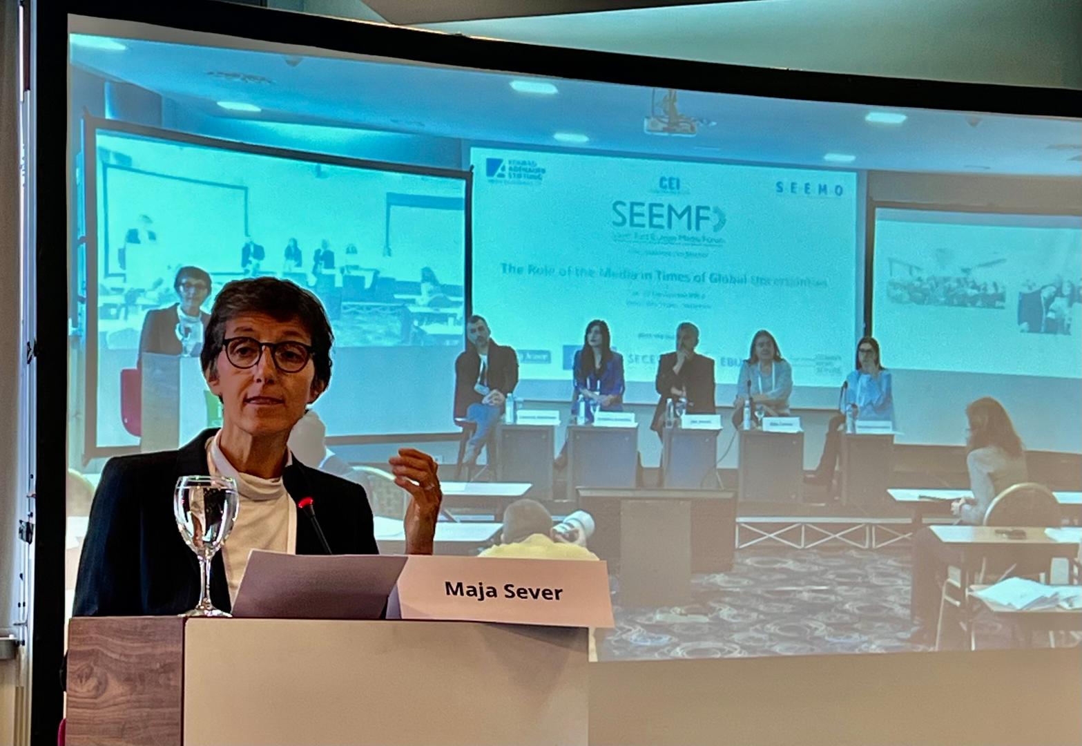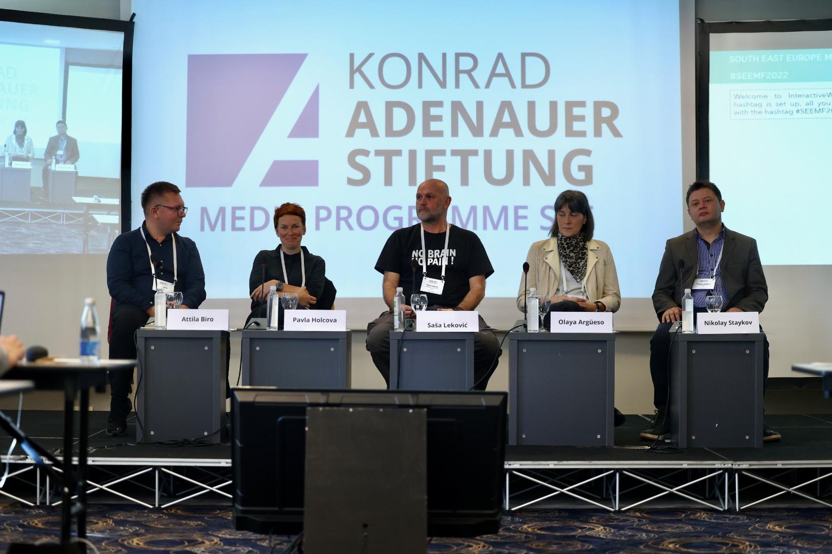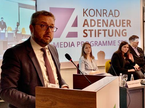 Oliver Vujovic, Secretary General of SEEMO, Hendrik Sittig, Director of the KAS Media Programme, and Nina Kodelja, Deputy Secretary General of CEI, opened the conference. In his speech, Hendrik Sittig reminded the audience that a war is currently raging in Europe - triggered solely by Russia and its president. He clarified that in the spirit of a free and democratic Europe, it is important that Ukraine wins the war and therefore it is necessary to do everything to achieve this. In addition to the three main organisers, Radka Betcheva, representative of the European Broadcasting Union (EBU) for Central and Eastern Europe, also welcomed the audience.