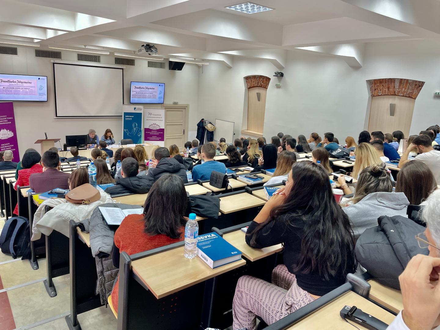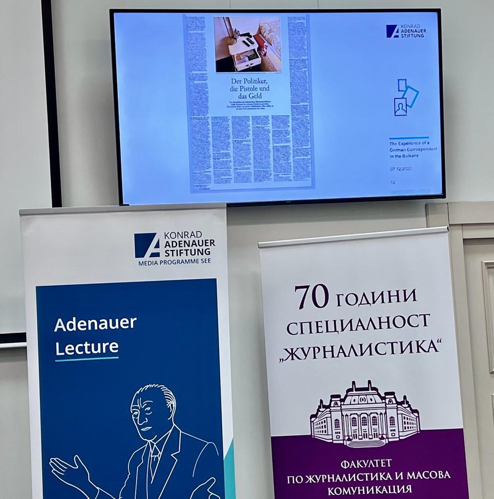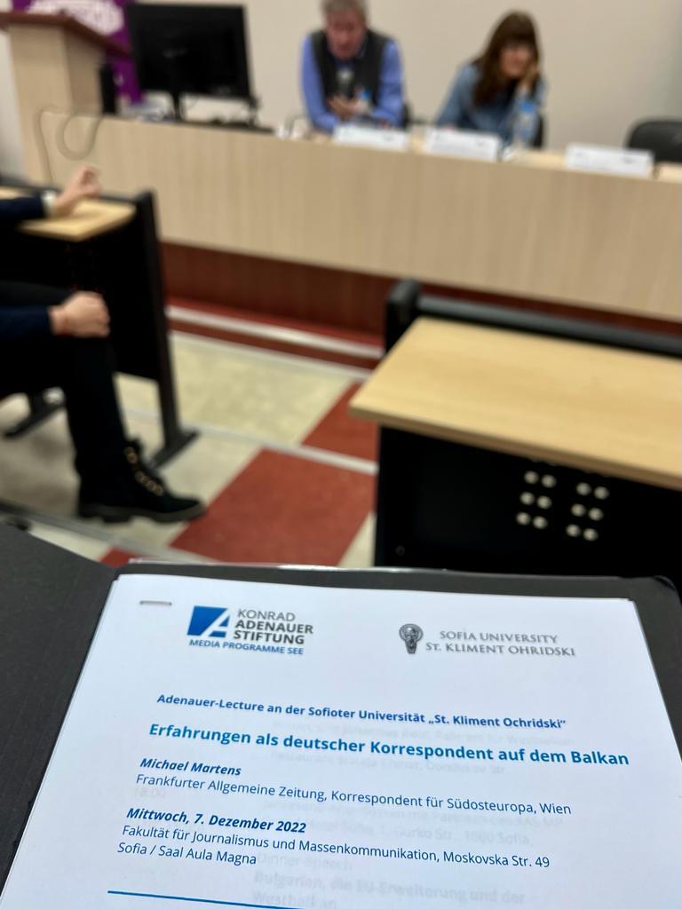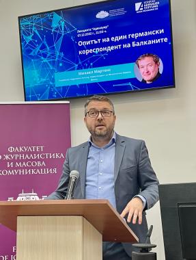 The event then continued with the Adenauer Lecture. As correspondent for Southeast Europe of FAZ, Michael Martens talked to the students and lecturers of Sofia University as well as numerous journalists about his many years of experience in the Balkans. How does one become a correspondent? Where does one get information abroad? How do interviews with presidents, for example, come about? These were just some of the questions Martens answered during his lecture. He also described some unexpected situations that arose during his work in the field. In this context, Martens gave some practical advices that could be useful for a correspondent's work. The event ended with a discussion with the students and university lecturers present.