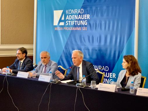 On the 7th of June, an expert meeting with Bulgarian journalists took place in Sofia - on the occasion of the next summit of the EU heads of state and government in Brussels at the end of June. The event was organised by the KAS Media Programme in cooperation with the Association of European Journalists - Bulgaria. The main topic was the EU enlargement process in the Western Balkans in the prospect of a possible opening of negotiations with Ukraine. The situation from a German perspective was described by Manuel Sarrazin, Special Representative of the Federal Government for the Western Balkans. A commentary was made by Vessela Tscherneva, Advisor on Foreign Policy to the Bulgarian Prime Minister. Afterwards, the discussion was continued by three Bulgarian scientists - Lyubomir Kyuchukov (Economics and International Relations Institute), Daniel Vachkov (Institute for Historical Studies) and Daniel Smilov (Centre for Liberal Strategies). They discussed with the journalists the current conflict between North Macedonia and Bulgaria, which is blocking the enlargement process. The experts stressed that the stability of the region is of great importance and that a solution suitable for both sides has to be found. The event was held under Chatham House Rules.