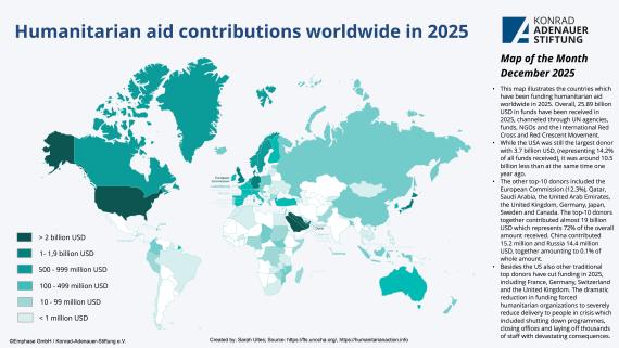 The year 2025 was a defining year for humanitarian aid worldwide. A total of only USD 25.89 billion in funds was received. Although the United States remained the largest donor with nearly USD 3.7 billion (14.2% of all funds), it gave USD 10.5 billion less than at the same time last year. The other top 10 donors included the European Commission (12.3%), Qatar, Saudi Arabia, the United Arab Emirates, Germany, Japan, Sweden and Canada. The 10 largest donors together contributed approximately USD 19 billion, which corresponds to almost 72% of the total amount. In addition to the US, other traditional top donor countries also cut their funding, including France, Germany, Switzerland and the United Kingdom. The drastic cuts forced humanitarian organisations to significantly reduce their aid to people in crisis situations. Programmes were suspended, offices closed and thousands of employees laid off. The majority of the funds went to the occupied Palestinian territories. Nevertheless, this only covered 61% of the corresponding needs, despite the officially declared famine. Other recipient countries in the top 10 included Syria, Sudan, Ukraine, Yemen, Afghanistan, South Sudan, the Democratic Republic of Congo, Ethiopia and Lebanon. The biggest humanitarian crisis in 2025 was in Sudan, where 30.4 million people (out of a total population of 46.8 million) needed humanitarian aid. Here too, famine was declared in parts of the country last year. However, due to funding cuts, only 39% of the humanitarian aid plan was covered.