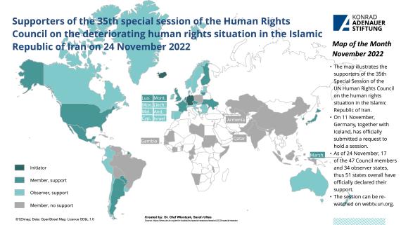 In light of the violent crackdown on protests following the death of 22-year-old Mahsa Amini in Iran, Germany and Iceland on 11 November officially requested to hold a special session of the UN Human Rights Council to address the increasingly deteriorating human rights situation, “especially with respect to women and children”. The 35th special session, which was the first one held on Iran, took place on 24 November. Prior to the debate, the initiative has received the support of a total of 51 states: 17 Council members and 34 observer states. According to UN figures, well over 300 people have been killed so far and tens of thousands have been arrested, many possibly facing the death penalty. Numerous UN special rapporteurs and working groups had called for the session to be held and for an international investigation mechanism to be established. With 25 votes in favor, 6 against and 16 abstentions, the Council indeed established an independent international fact finding mission to investigate alleged violations related to the protests that began on 16 September 2022. In the last minute, China had put forward an oral amendment which aimed at abolishing the mechanism. It was rejected with 6 to 25 and 15 abstentions.