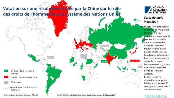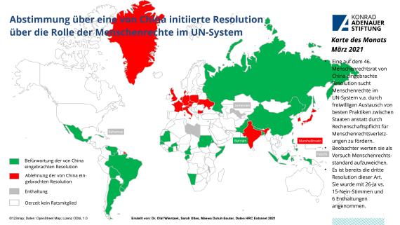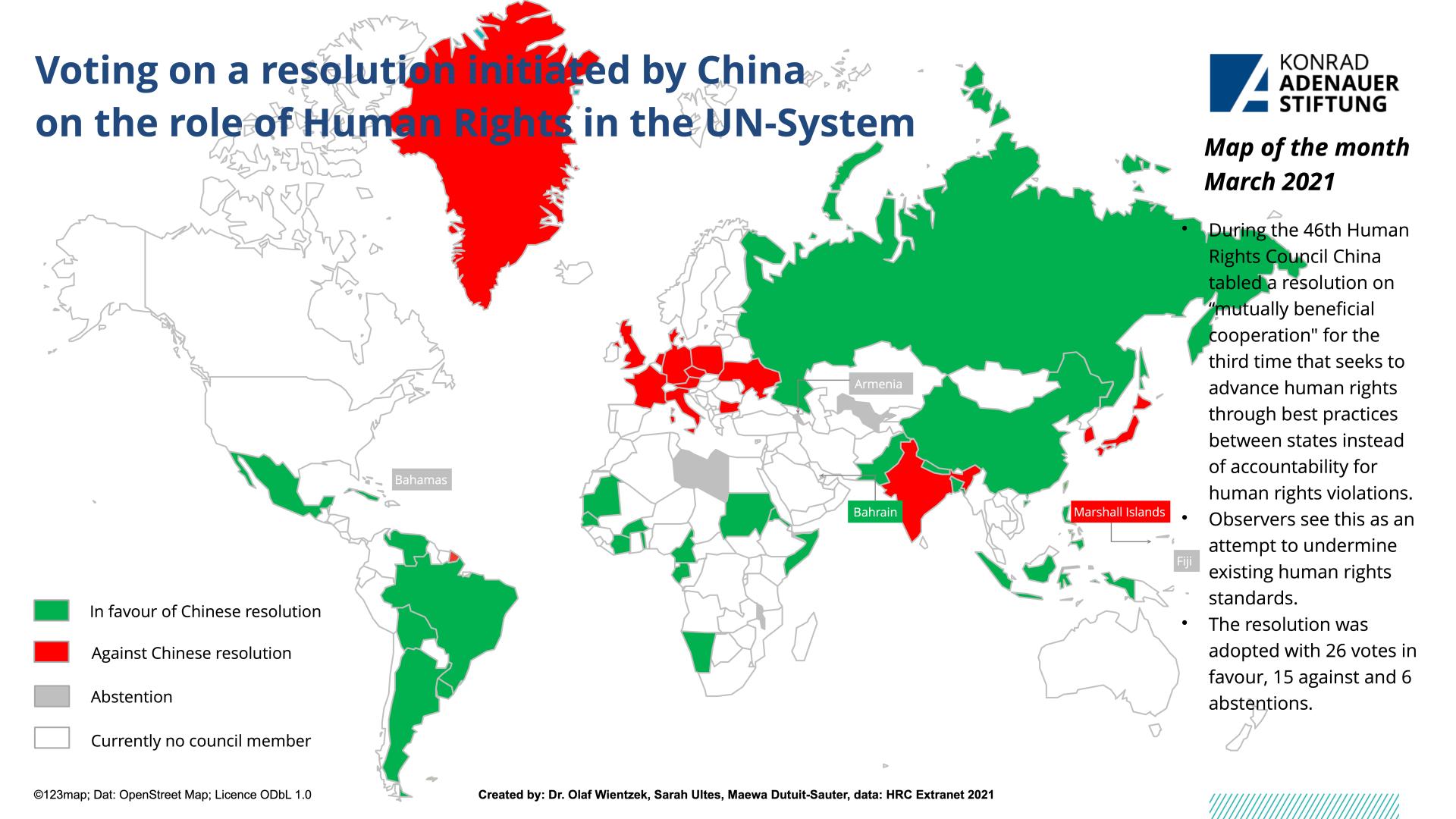 During the 46th Human Rights Council China tabled a resolution on “mutually beneficial cooperation" for the third time that seeks to advance human rights through best practices between states instead of accountability for human rights violations. Observers see this as an attempt to undermine existing human rights standards. The resolution was adopted with 26 votes in favour, 15 against and 6 abstentions. In 2020 23 states voted in favour, 16 against and 8 abstained and in 2018 28 states voted in favour while only the US voted against and 17 states abstained.