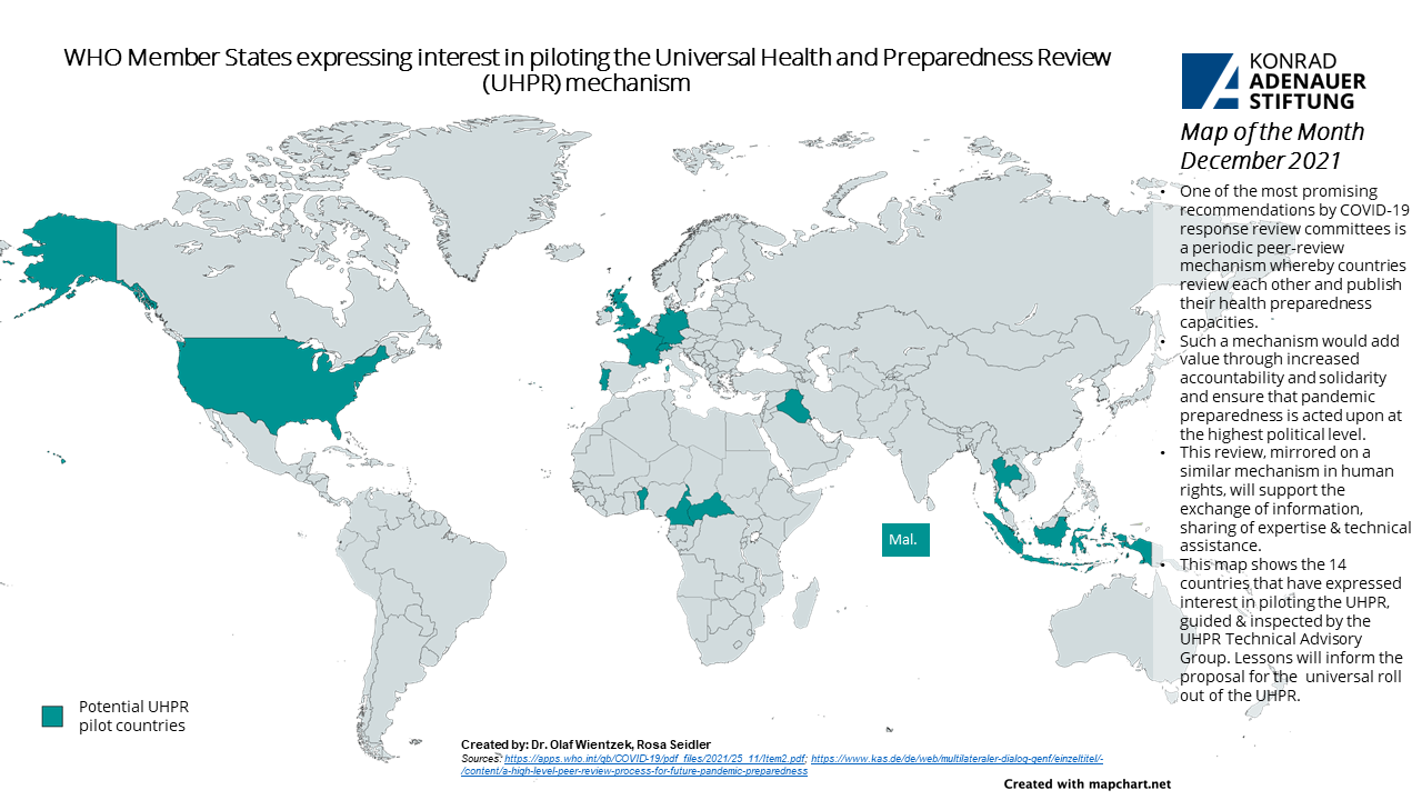 The idea echoed in recommendations by COVID-19 response review committees is a mechanism whereby countries review each other and publish their health preparedness capacities. Such a process would add value through increased accountability and solidarity and ensure that pandemic preparedness is acted upon at the highest political level. It would also support the exchange of information, sharing of expertise & technical assistance. This pilot stage is very important as its lessons will inform the draft decision for the universal rollout of the UHPR. The different profiles of the depicted states show the broad interest in such a mechanism.