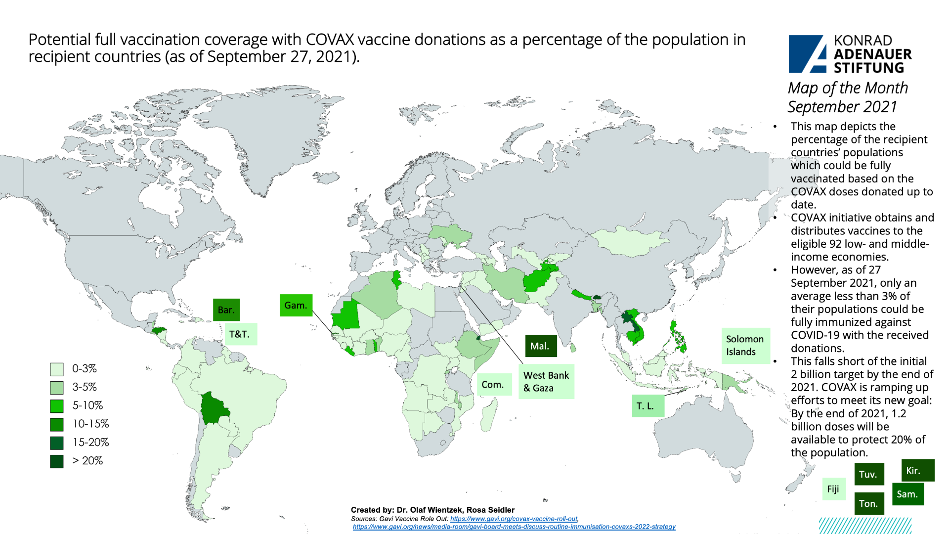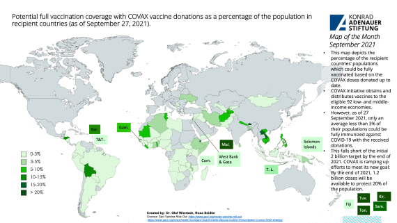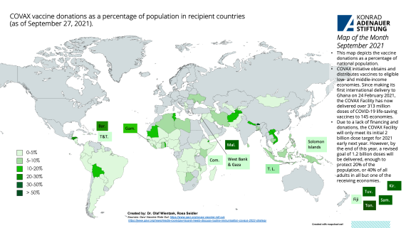 September's map of the month illustrates how many COVAX vaccine donations were delivered to recipient countries by the end of September. The COVAX Facility, co-led by the Coalition for Epidemic Preparedness Innovations (CEPI), Gavi, and the World Health Organization (WHO), advocates for rapid, fair, and equitable access to COVID-19 vaccines around the world.