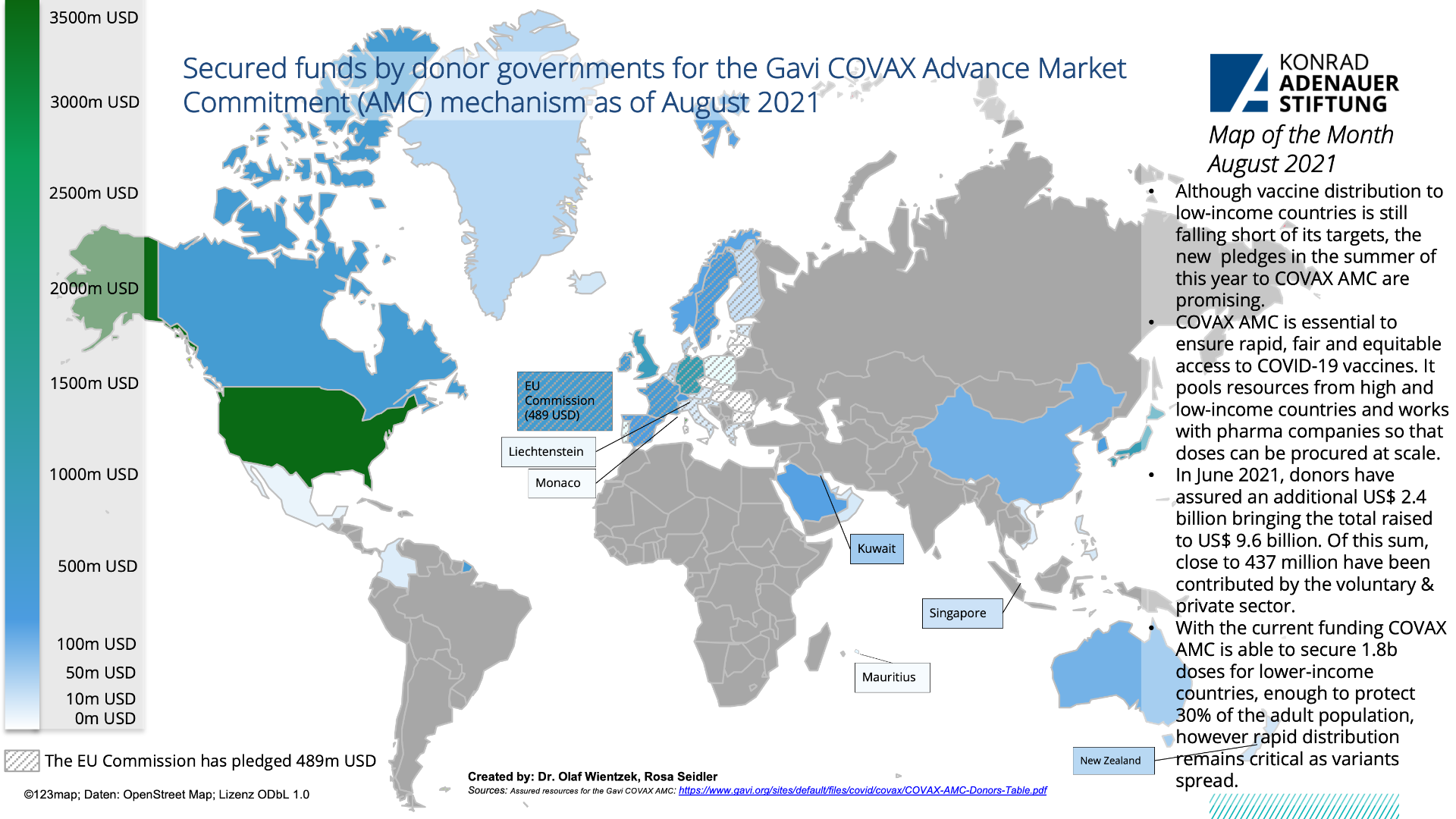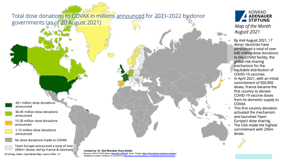The Map of the Month of August visualizes the donor countries' contributions to two different structures via which the COVAX initiative obtains and distributes vaccines to the eligible 92 low- and middle-income economies.
