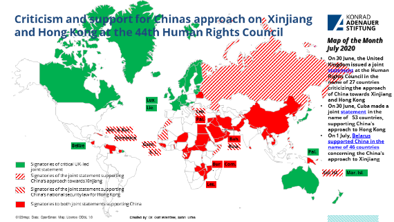 In the framework of the 44th Human Rights Council in Geneva, 27 countries supported a UK-led joint statement which heavily criticized China's actions in Xinjiang and the controversial national security law for Hongkong. However, a statement by 46 countries, led by Belarus, dismissed criticism towards China regarding Xinjiang. Another statement, presented by Cuba and backed by 53 countries defended the national security law for Hongkong. The following map illustrates which countries supported the respective statements.