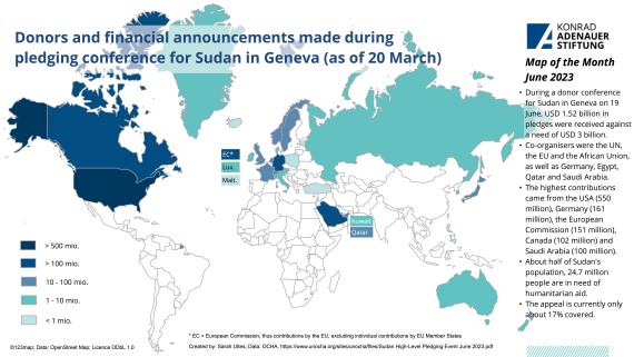 During a donor conference for Sudan in Geneva on 19 June, USD 1.52 billion in pledges were received against a need of USD 3 billion. Co-organisers were the UN, the EU and the African Union, as well as Germany, Egypt, Qatar and Saudi Arabia. The highest contributions came from the USA (550 million), Germany (161 million), the European Commission (151 million), Canada (102 million) and Saudi Arabia (100 million). About half of Sudan's population, 24.7 million people are in need of humanitarian aid. The pledges made fall far below the massive $2.57 billion needed for the 2023 Humanitarian Response Plan (HRP) which is currently only about 17% covered and the $445 million for the Regional Response Plan (RRP) which is only about 13% covered.