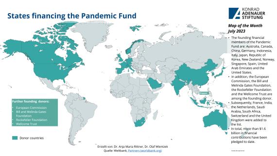 To underscore their demands for equity in the pandemic agreement, 19 WHO Member States joined together to form the Group for Equity. The Group for Equity currently includes Bangladesh, Botswana, Brazil, China, Colombia, Dominican Republic, Fiji, India, Indonesia, Kenya, Malaysia, Mexico, Pakistan, Paraguay, Peru, Philippines, South Africa, Tanzania and Thailand. The founding financial members of the Pandemic Fund are: Australia, Canada, China, Germany, Indonesia, Italy, Japan, Republic of Korea, New Zealand, Norway, Singapore, Spain, United Arab Emirates and the United States. In addition, the European Commission, the Bill and Melinda Gates Foundation, the Rockefeller Foundation and the Wellcome Trust are among the founding donor. Subsequently, France, India, the Netherlands, Saudi Arabia, South Africa, Switzerland and the United Kingdom were added to the list. In total, more than $1.6 billion in financial contributions have been pledged to date. It is unusual that countries in Southeast Asia in particular are also acting as donor countries.