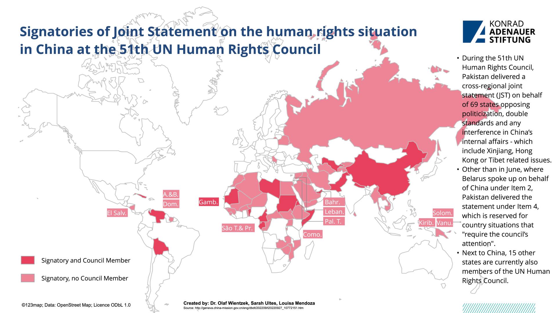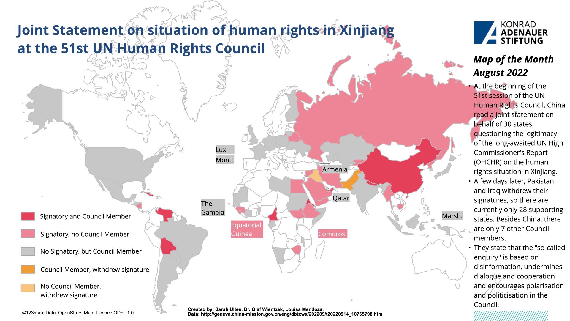 At the beginning of the 51st session of the UN Human Rights Council, China read a joint statement on behalf of 30 states questioning the legitimacy of the long-awaited UN High Commissioner's Report (OHCHR) on the human rights situation in Xinjiang. "The so-called assessment is based on disinformation, undermines dialogue and cooperation in the field of human rights, and exaggerates the existing trend of politicization and polarization", the statement reads. A few days later, however, Pakistan and Iraq withdrew their signatures. The number of supporters stands now only at 28. Besides China, only 7 other Council members are left among the signatories. Later during the Council, Pakistan delivered a joint statement on behalf of 69 states (15 of which being members of the Council) under Item 4 which opposes politicization, double standards and any interference in China’s internal affairs - which include Xinjiang, Hong Kong or Tibet related issues.