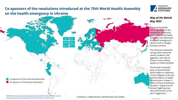 During the 75th World Health Assembly Ukraine and Russia introduced resolutions on 23 and 24 May that addressed the health emergency in Ukraine and in refugee-hosting countries. While the Ukrainian resolution, among other demands, clearly condemns the aggressor and calls on Russia to stop military attacks on health facilities, the Russian resolution makes no reference to the instigator of the war and the attacks on health infrastructure. Instead, it refers to the humanitarian situation “in and around Ukraine” blurring lines about the victims of the war of aggression.