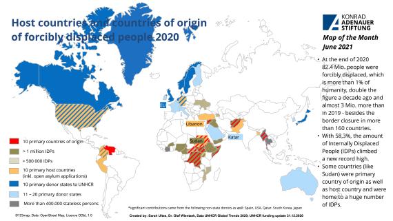 At the end of 2020 82.4 Mio. people were forcibly displaced, which is more than 1% of humanity, double the figure a decade ago and almost 3 Mio. more than in 2019 - besides the border closure in more than 160 countries. With 58,3%, the amount of Internally Displaced People (IDPs) climbed a new record high. The dynamics of protracted conflicts, the effects of climate change as well as COVID-19 are increasingly interconnected and mutually reinforcing in driving displacement.