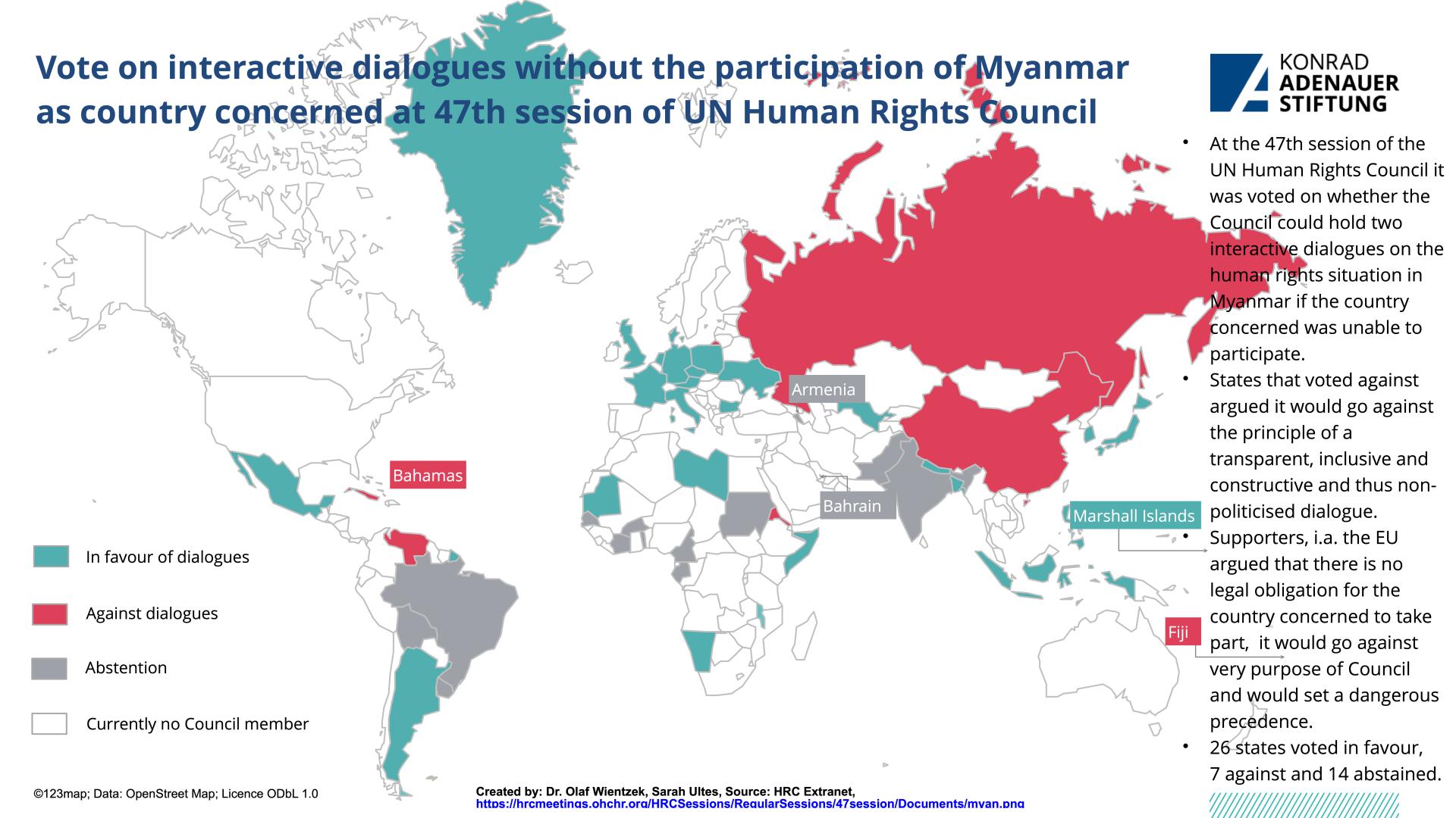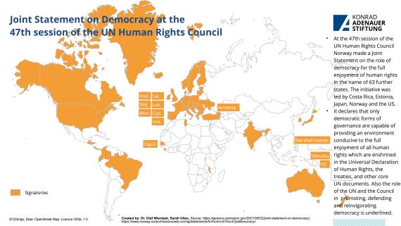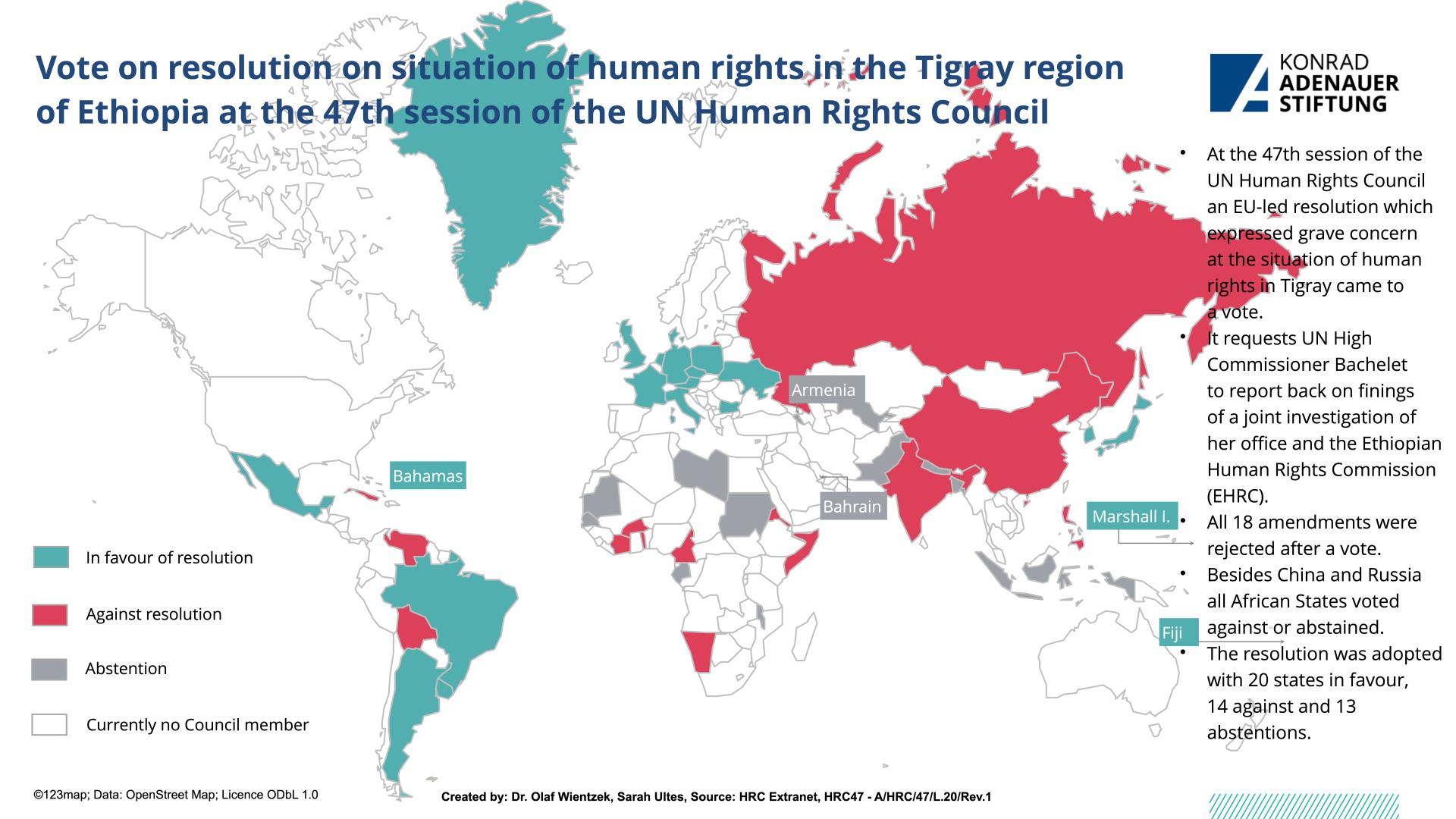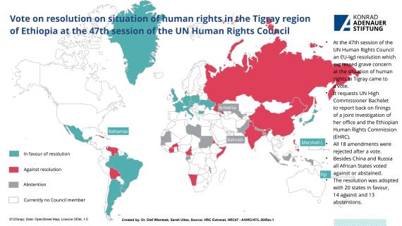 The 47th UN Human Rights Council met in Geneva from June 21 to July 14, 2021, marking its 15th anniversary. Important joint statements were made, among other things, on the human rights situation in Xinjiang, Hong Kong and Tibet or on the role of democracies. There were votes, among other things, on the human rights situation in the Ethiopian region of Tigray or on the question of whether the Council may discuss the situation of a country without its presence.