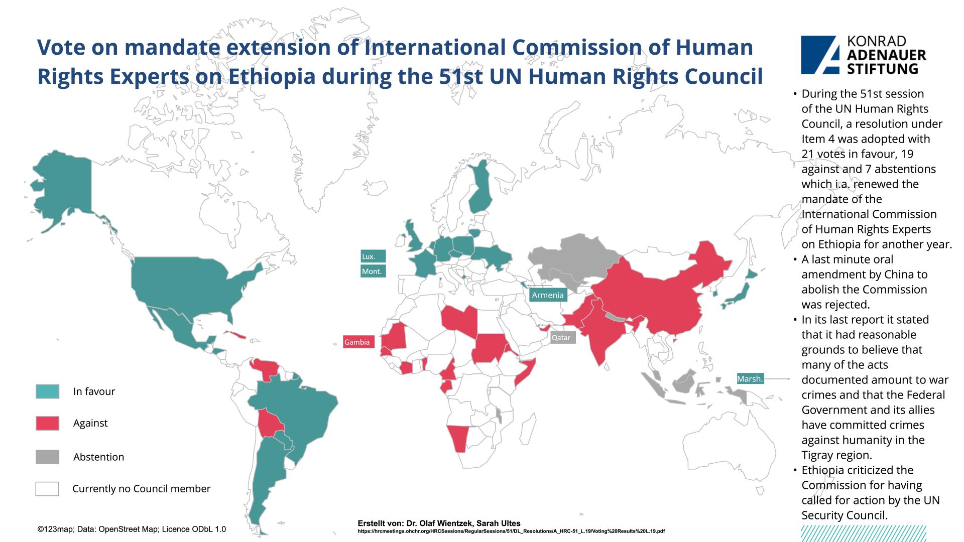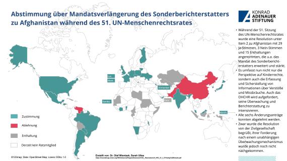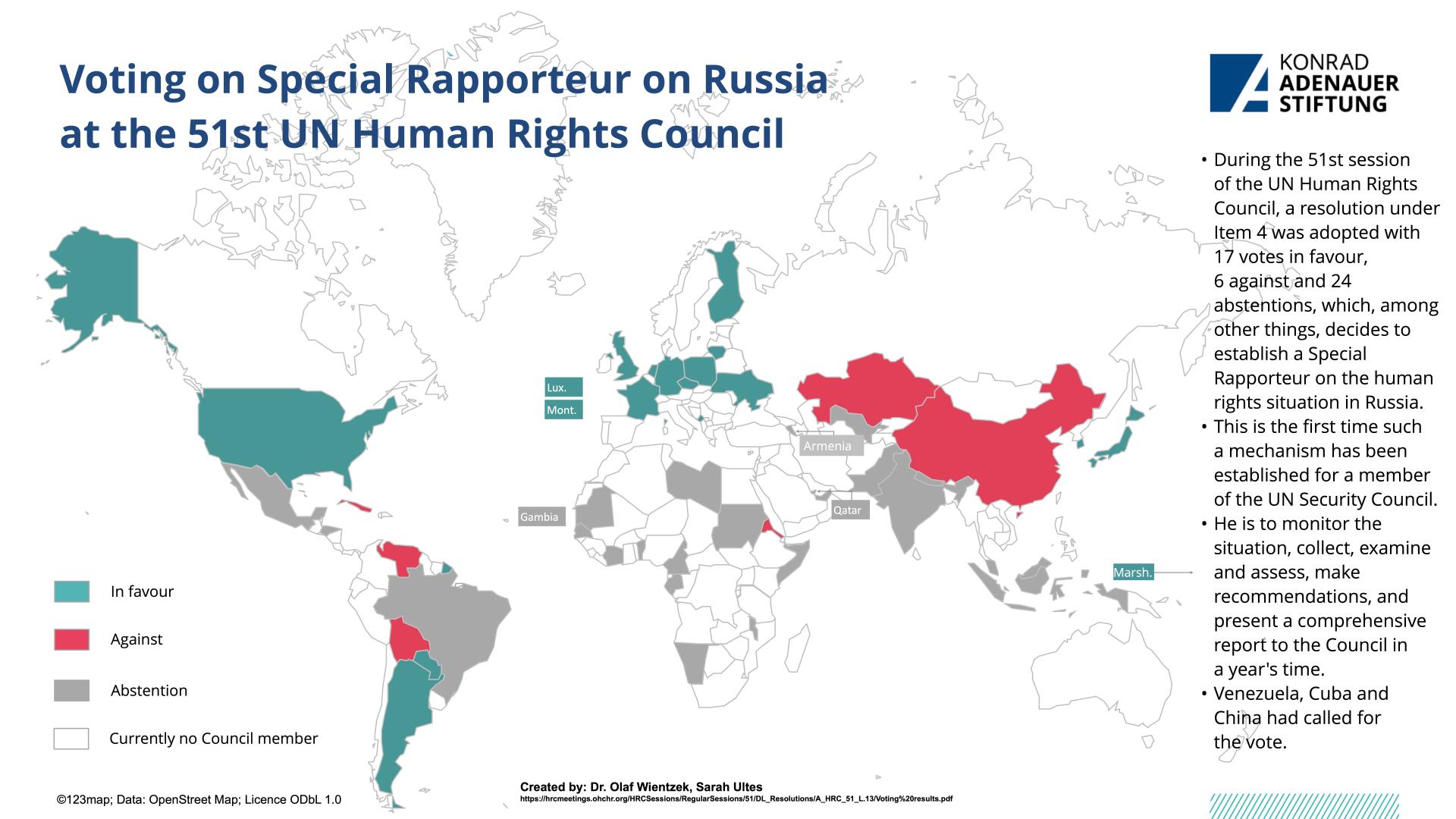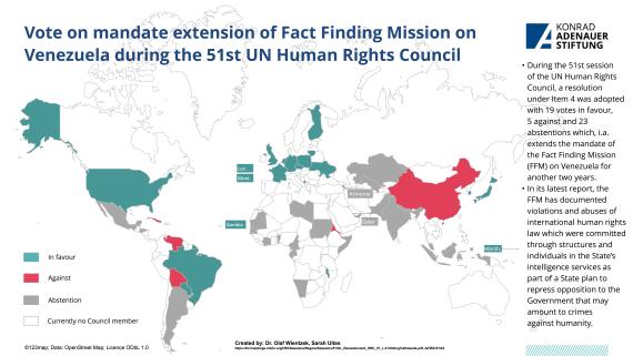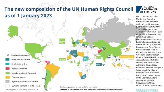 During the 51st session of the UN Human Rights Council, among others two texts on two UN Security Council members - China and Russia - were put to the vote. Following the release of the UN High Commissioner for Human Rights' report on the situation in the Xinjiang Autonomous Region on 31 August, the US, together with Canada, Denmark, Finland, Iceland, Norway, Sweden and the UK, tabled a draft decision to debate the issue at the next session under agenda item 2. After China called for a vote, the text was rejected with 19 votes against, 17 in favour and 11 abstentions. On the other hand, a resolution was adopted with 17 votes in favour, 6 against and 24 abstentions, which, among other things, decides to establish a Special Rapporteur on the human rights situation in Russia. This is the first time that such a mechanism will be established for a member of the UN Security Council. Furthermore, the mandates of the Fact-Finding Mission on Venezuela, the International Commission of Experts on Human Rights in Ethiopia and the Special Rapporteurs on Afghanistan were extended. In addition, 12 new members were elected and two current members were re-elected (Germany and Sudan) to serve as members of the Council starting from 1 January, 2023.
