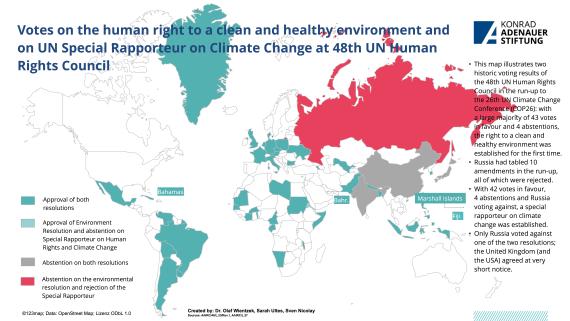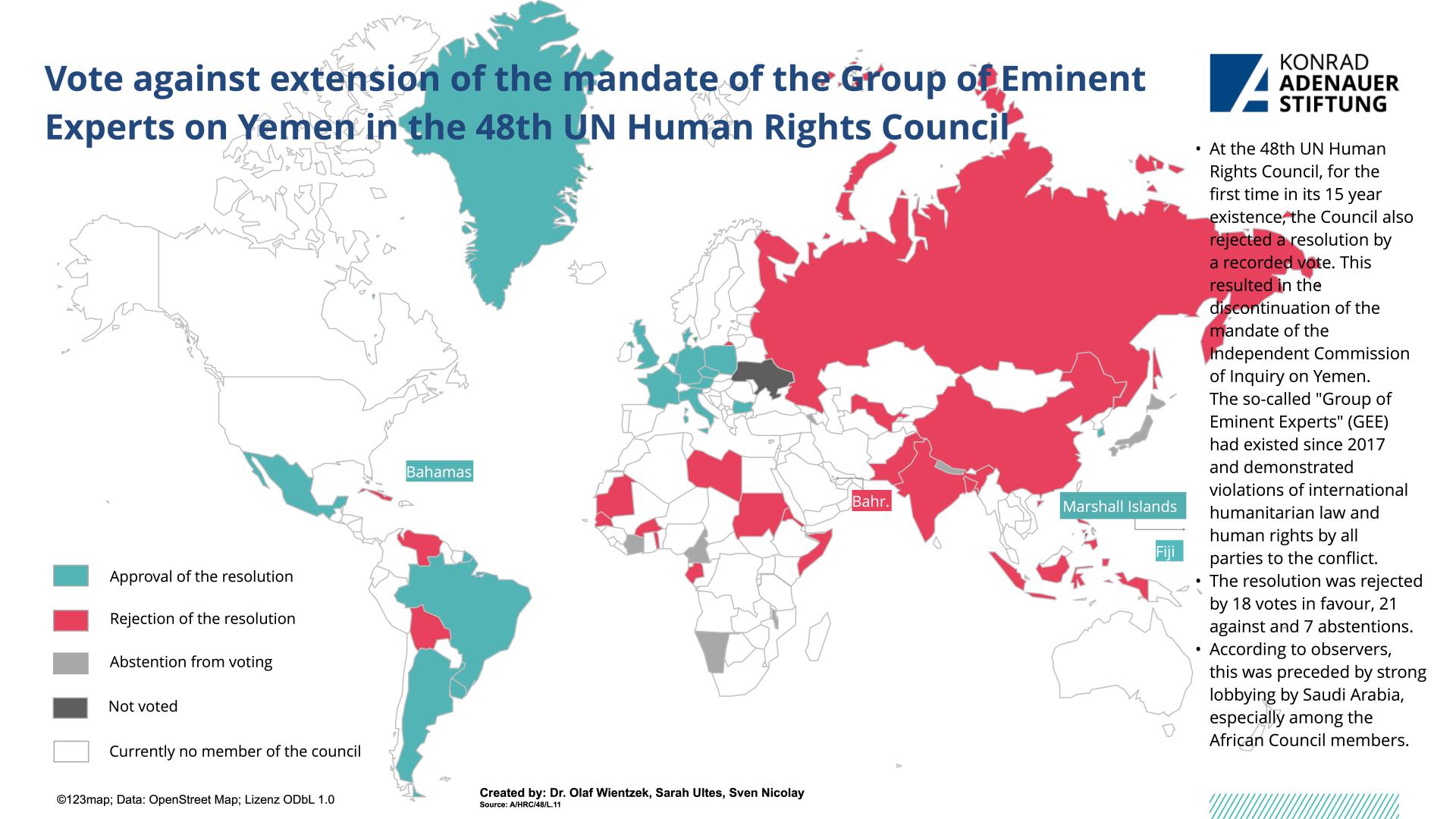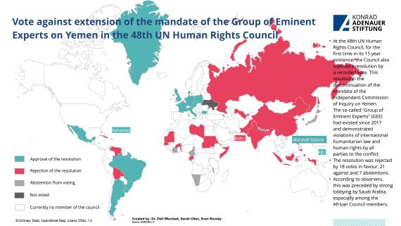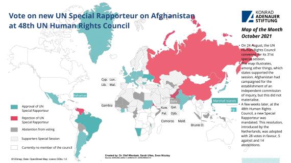 The 48th UN Human Rights Council convened in Geneva from September 13 to October 11, 2021. Important votes were held, among other things, on a special rapporteur on Afghanistan, on the termination of the mandate of the Group of Eminent Experts on Yemen or on the recognition of the right to a clean and healthy environment and the establishment of a special rapporteur on climate change and human rights. On October 14, the new members of the UN Human Rights Council were elected in the UN General Assembly in New York. With a comeback of the US others, all members of the UN Security Council will be represented on the Human Rights Council starting from January 1, 2022,