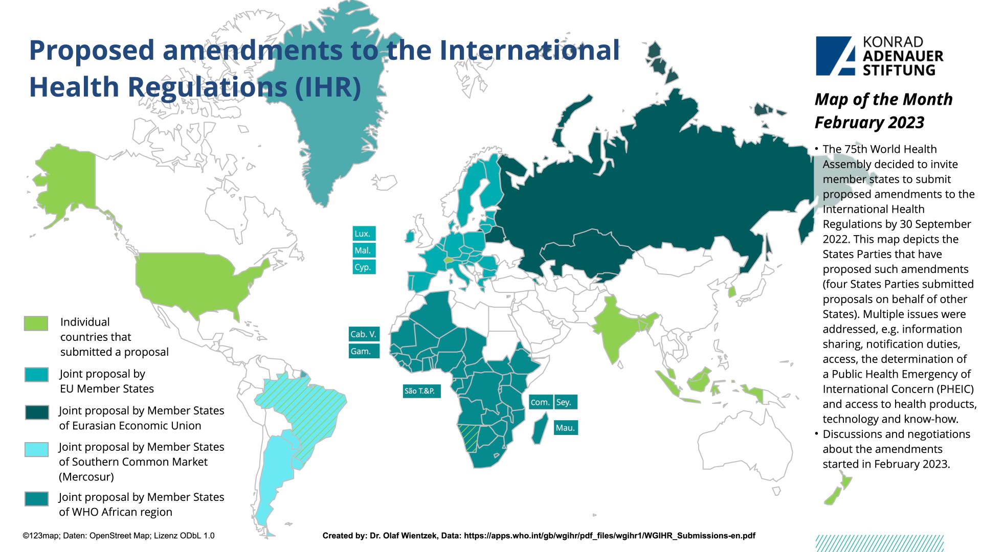 The 75th World Health Assembly decided to invite member states to submit proposed amendments to the International Health Regulations by 30 September 2022. This map depicts the States Parties that have proposed such amendments (four States Parties submitted proposals on behalf of other States). Multiple issues were addressed, e.g. information sharing, notification duties, access, the determination of a Public Health Emergency of International Concern (PHEIC) and access to health products, technology and know-how. Discussions and negotiations about the amendments started in February 2023.