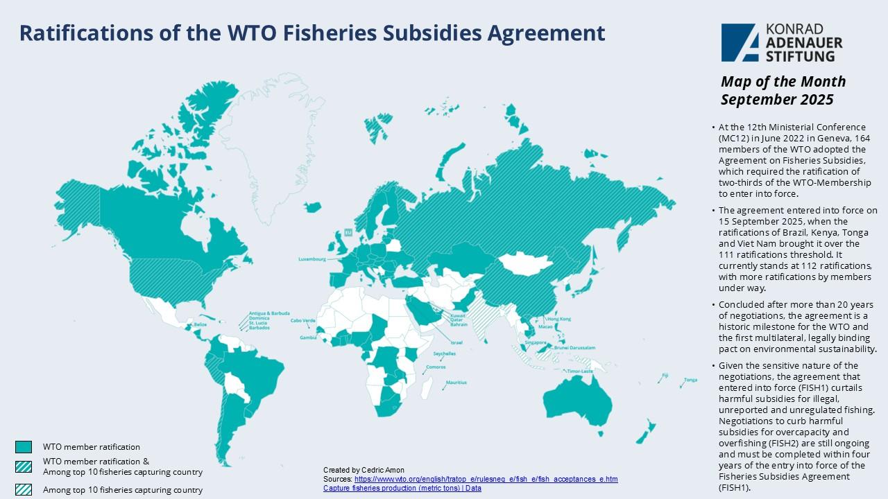 On 15 September 2025, the World Trade Organization's Agreement on Fisheries Subsidies entered into force after Brazil, Kenya, Tonga and Vietnam completed the decisive ratifications. The agreement, which came about after more than 20 years of negotiations, is considered a historic milestone for the WTO and is the first multilateral, legally binding pact on environmental sustainability. 111 ratifications (two-thirds of WTO membership) were required for it to enter into force. The total number of ratifications now stands at 112, with more in the pipeline. The agreement curtails harmful subsidies for illegal, unreported and unregulated fishing (FISH1), while negotiations on subsidies regarding overcapacity and overfishing (FISH2) are still ongoing and must be concluded within four years. In addition, the entry into force of the Agreement also activate the WTO Fisheries Fund, which will support developing countries and least developed countries in implementing the Agreement.