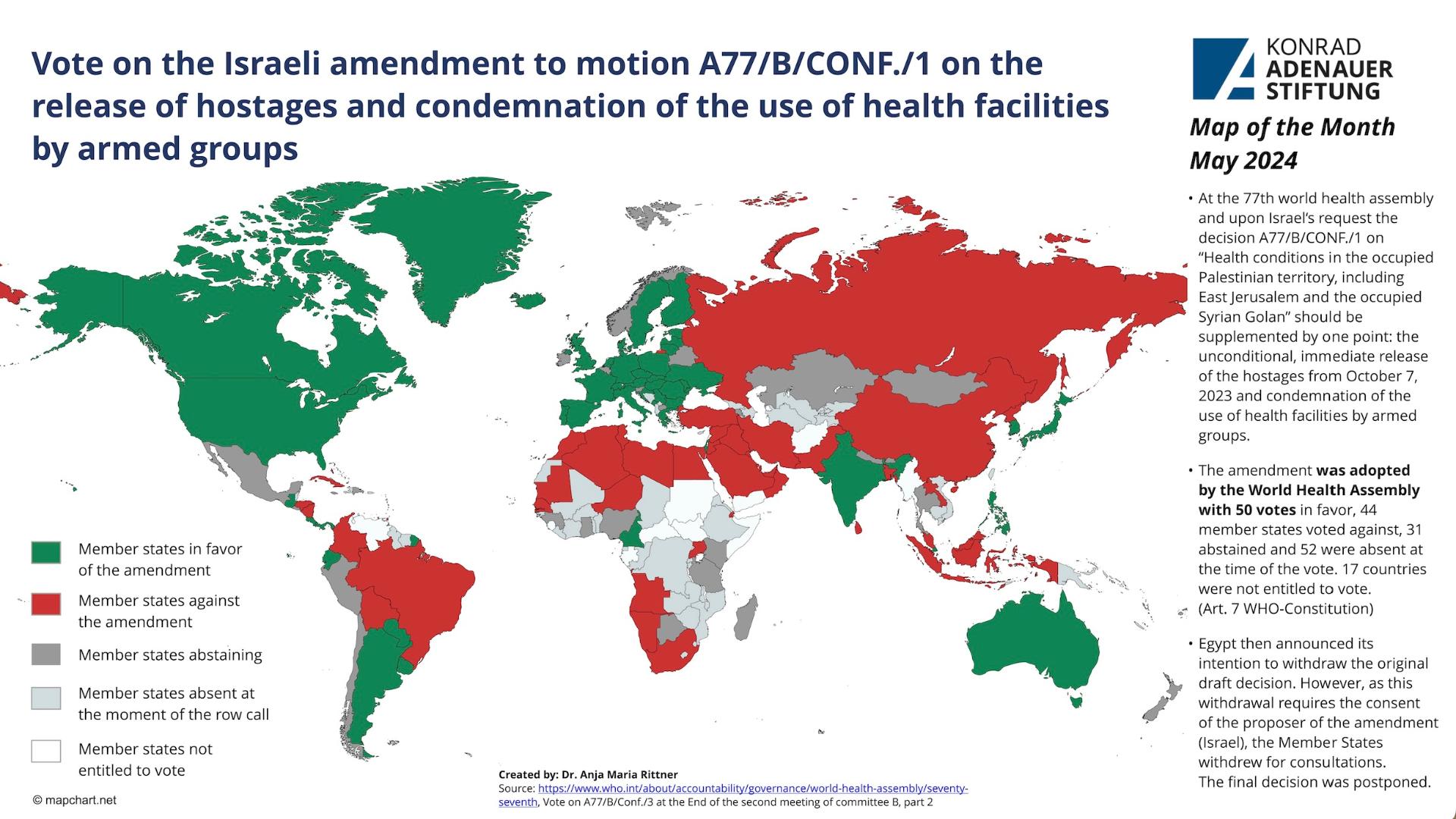 The amendment was adopted by the World Health Assembly with 50 votes in favor, 44 member states voted against, 31 abstained and 52 were absent at the time of the vote. 17 countries were not entitled to vote (Art. 7 WHO-Constitution).