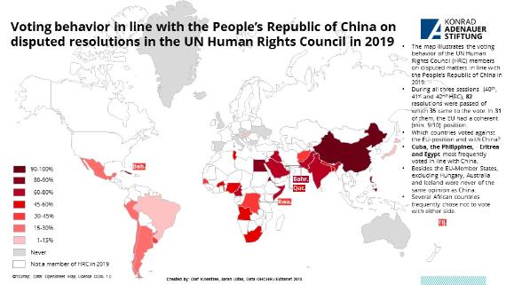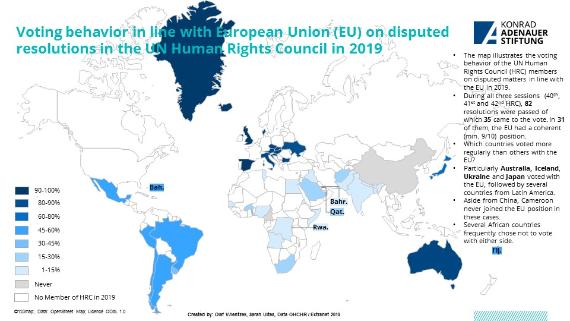 The maps illustrate the voting behaviour of the UN Human Rights Council (HRC) members on disputed matters in 2019. During all three sessions (40th, 41st and 42nd HRC), 82 resolutions were passed of which 35 came to the vote. In 31 of them, the EU had a coherent position (at least 9/10 EU members voted the same way). In all 31 cases, China voted differently than the EU. Which countries voted with the EU, which with China? While Australia, Iceland, Ukraine and Japan voted particularly often with the EU, Cuba, the Philippines, Eritrea and Egypt voted with China in most cases. Many countries, particularly from the African continent, often did not vote with either side.