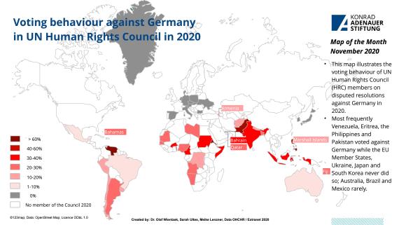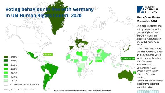 This map illustrates the voting behaviour of UN Human Rights Council (HRC) members on disputed resolutions in line with and against Germany in 2020. During all three sessions (43rd, 44th, 45th) 97 resolutions were passed of which 31 camp to the vote. 19 of them (around 60%) were adopted in favour of Germany. Which countries voted in line with Germany, which did not? The EU Member States, Ukraine, Australia, Japan and South Korea voted most commonly in line with Germany. Venezuela and Cameroon scarcest were in line with the German position. Several African countries frequently abstained from the vote.