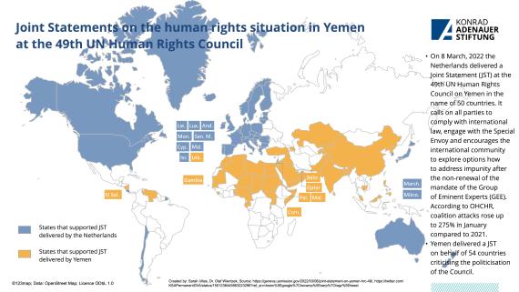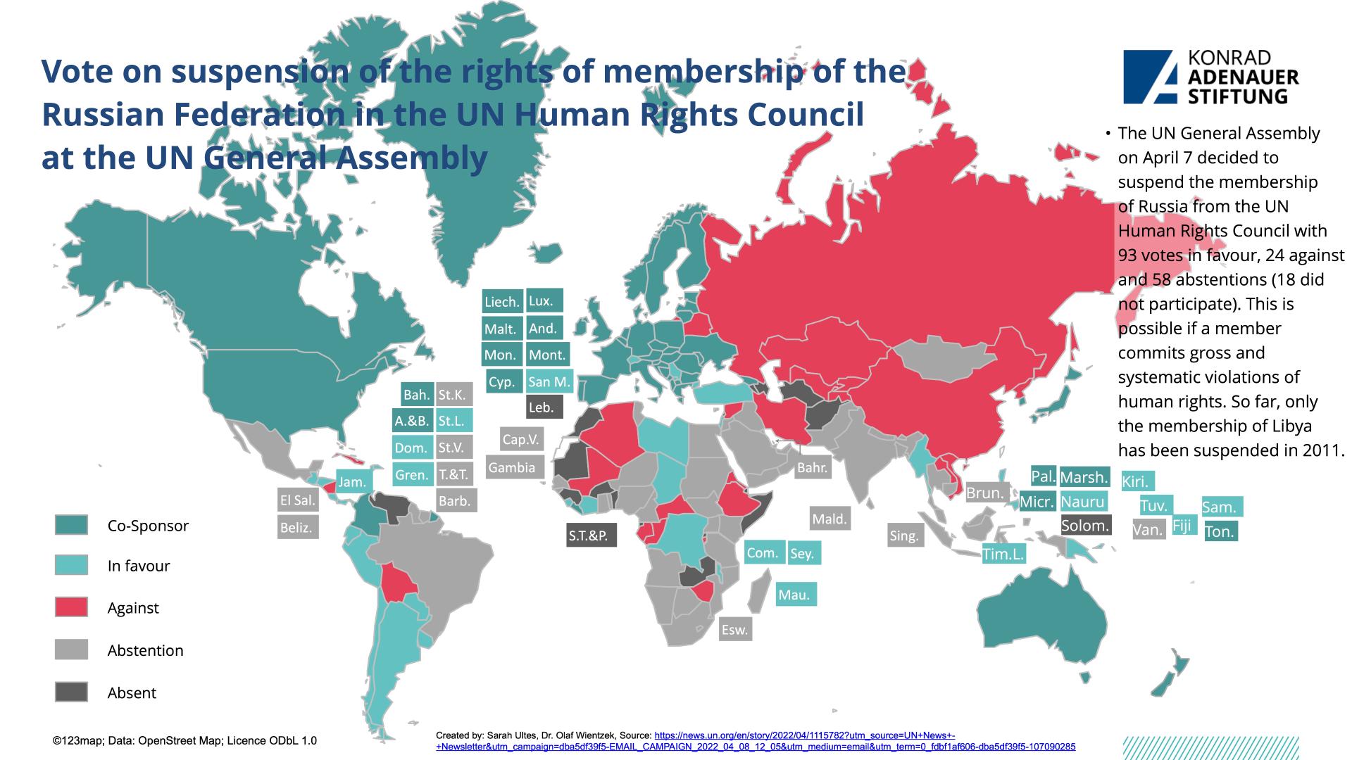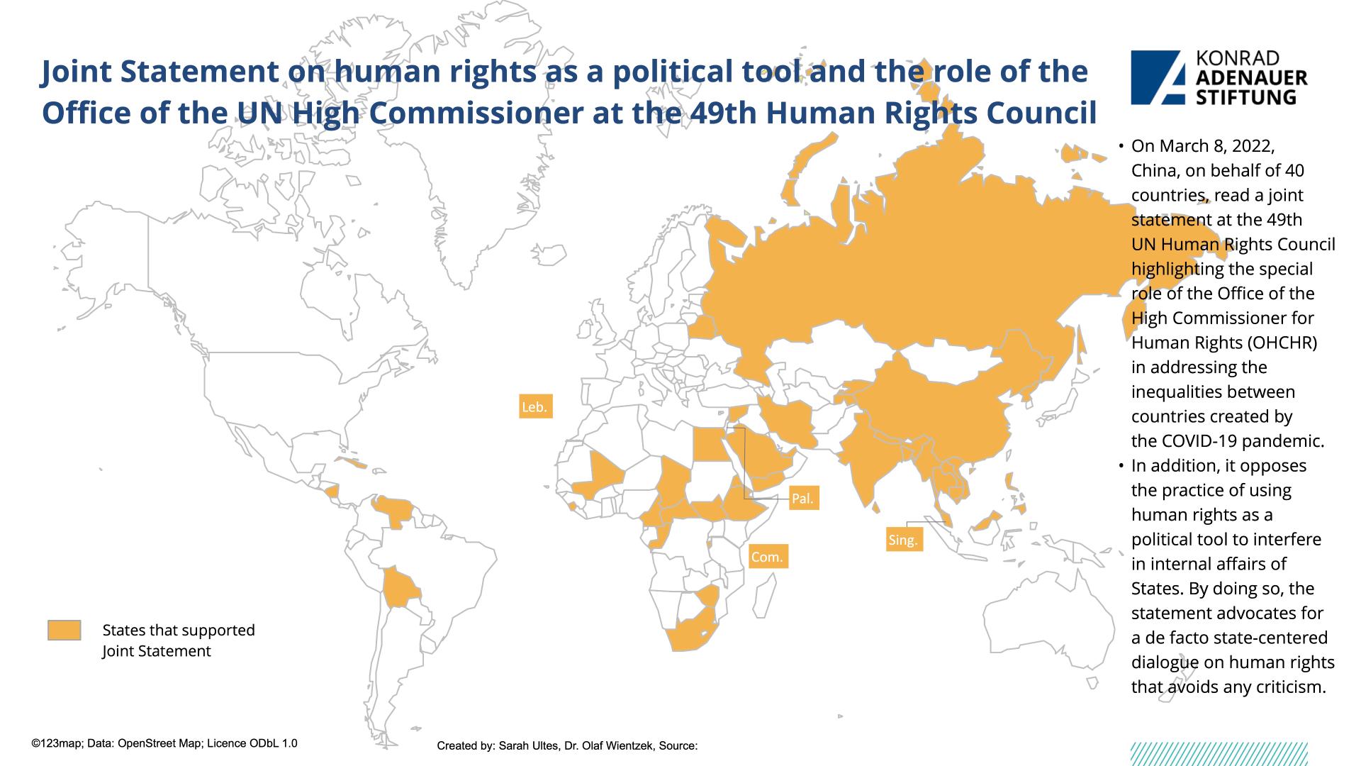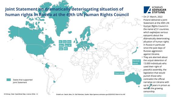 The 49th UN Human Rights Council convened in Geneva from February 28 to April 1, 2022. It was the longest session in the Council's history and a particular test for multilateral diplomacy, not only because of the situation in Ukraine. In addition to the emergency session and the establishment of a Commission of Inquiry on Ukraine, there were other important votes, including on the extension of the mandate of the UN High Commissioner to further investigate human rights violations in Belarus or the establishment of a group of human rights experts on Nicaragua. Numerous joint statements were delivered, including on the human rights situation in Russia and in Yemen. Meanwhile, China, once again spoke out in favor of a state-centered "human rights dialogue" and a modified role for the Office of the UN High Commissioner in order to avoid criticism and scrutiny.