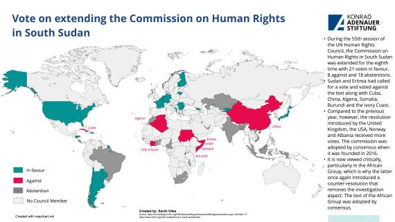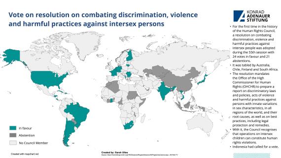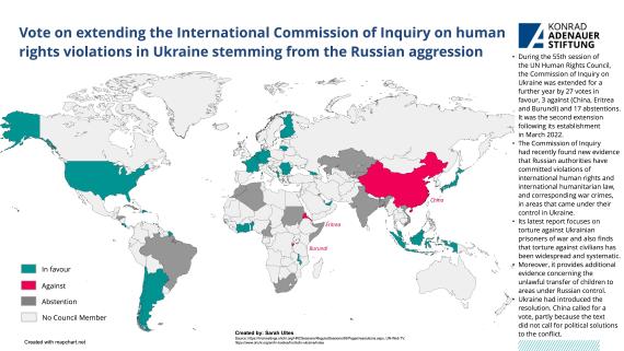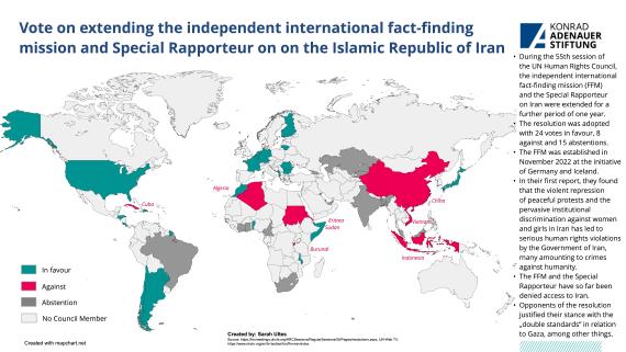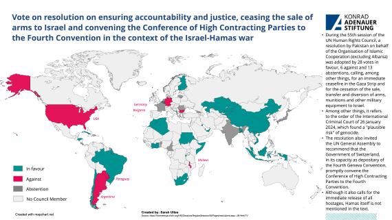 The 55th UN Human Rights Council met from 26 February to 5 April 2024, making it the longest Council session to date. A total of 33 resolutions were adopted, comparatively fewer than in the previous year. This again included numerous country mandates. Among others, the fact-finding mission on Iran was extended, which was set up at the instigation of Germany and Iceland in November 2022 following the death of Mahsa Amini. It came to the conclusion that the subsequent repression of the nationwide protests under the slogan "Women, Life, Freedom" and the pervasive institutional discrimination against women and girls may amount to crimes against humanity. The International Commission of Inquiry on human rights violations in Ukraine stemming from the Russian aggression was also extended. In its latest report, the group focused on evidence on torture against Ukrainian prisoners of wars and concerning the unlawful transfer of children to areas under Russian control. Moreover, a group of three independent experts was mandated for the first time to further investigate the human rights situation in Belarus. The Commission on Human Rights in South Sudan was also extended. And a historic resolution on the rights of intersex people was adopted. However, the spring session focused mainly on the war in Gaza. Among others, a resolution on accountability was adopted, which calls for an immediate ceasefire, the cessation of the sale, transfer and diversion of arms, munition and other military equipment to Israel as well as for a conference of the High Contracting Parties to the Fourth Geneva Convention. The text was criticised by Germany and the USA in particular, as although it calls for the immediate release of all hostages, Hamas itself is not mentioned.